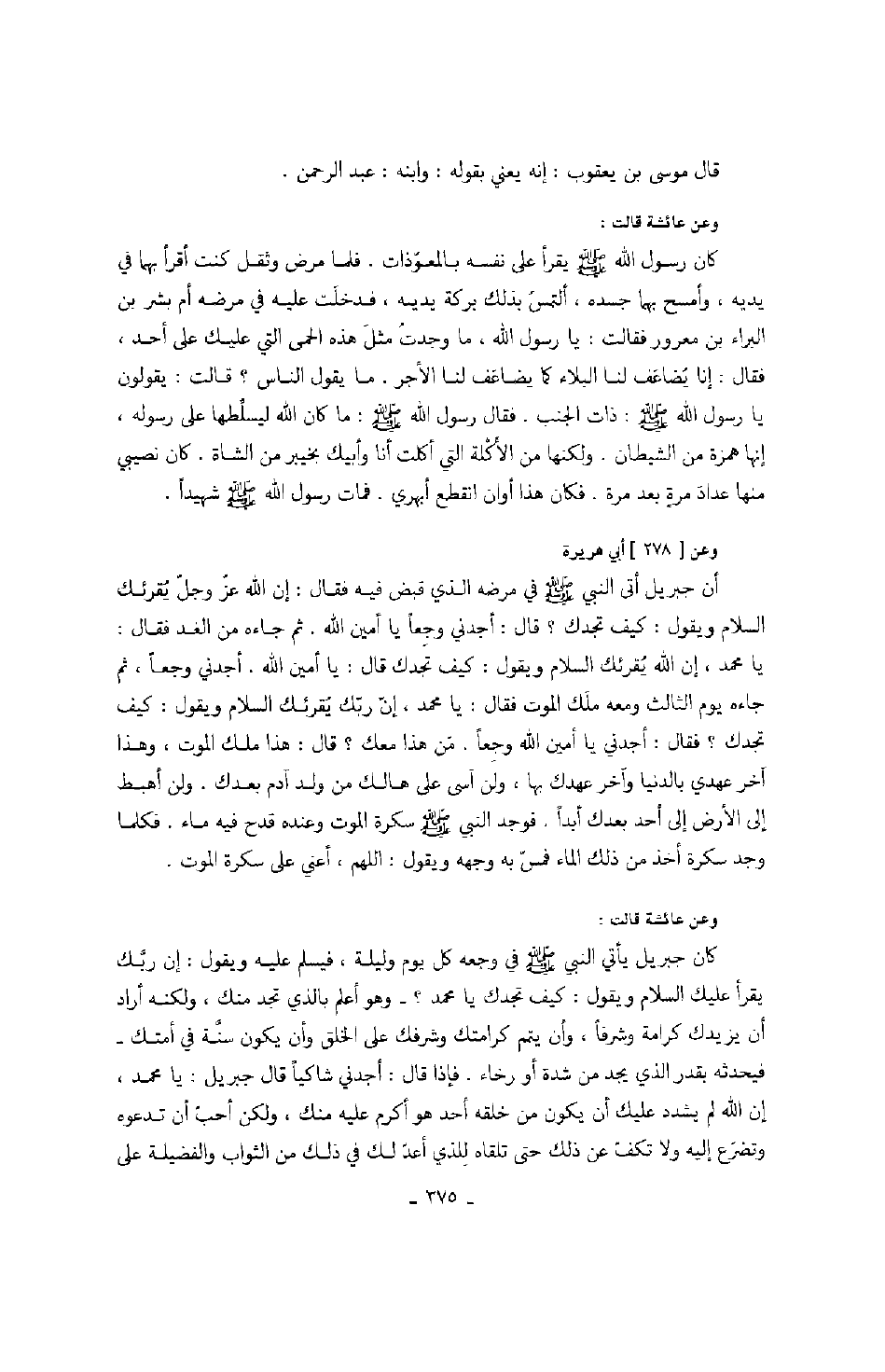 قال موسى بن يعقوب: أنه يعني بقوله: وابنه: عبد الرحمن. وعن عائشة قالت: كان رسول الله صَلَّى اللهُ عَلَيْهِ وَسَلَّمَ يقرأ على نفسه بالمعوذات. فلما مرض وثقل كنت أقرأ بهما في يديه، وأمسح بها جسده، ألتمس بذلك بركة يديه، فدخلت عليه في مرضه أم البشير بن البراء بن معرور فقالت: يا رسول الله، ما وجدت مثل هذه الحمىالتي عليك على أحد، فقال: إنا يضاعف لنا البلاء كما يضاعف لنا الأجر. ما يقول الناس؟ قالت: يقولون يا رسول الله صَلَّى اللهُ عَلَيْهِ وَسَلَّمَ ذات الجنب. فقال رسول الله صَلَّى اللهُ عَلَيْهِ وَسَلَّمَ: ما كان الله ليسلطها على رسوله، إنها همزة من الشيطان. ولكنها من الأكلة التي أكلت أنا وأبيك بخيبرمن الشاة. كان نصيبي منها عداد مرةٍ بعد مرة. فكان هذا أوان انقطع أبهري فمات رسول اللهم شهيداً. وعن أبي هريرة أن جبريل أتى النبي في مرضه الذي قبض فيه فقال: إن الله غز وجل يقرئك السلام ويقول: كيف تجدك؟ قال: أجدني وجعاً يا أمين الله. ثم جاءه من الغد فقال: يا محمد، إن الله يقرأك السلام ويقول: كيف تجدك قال: يا أمين الله. أجدني وجعاً، ثم جاءه يوم الثالث ومعه ملك الموت فقال: يا محمد، إن ربك يقرئك السلام ويقول: كيف تجدك؟ فقال: أجدني يا أمين الله وجعاً. من هذا معك؟ قال: هذا ملك الموت، وهذا آخر عهدي بالدنيا وآخر عهدك بها، ولن آسى على هالك من ولد آدم من بعدك. ولن أهبط إلى الأرض إلى أحد بعدك أبداً. فوجد النبي صَلَّى اللهُ عَلَيْهِ وَسَلَّمَ سكرة الموت وعنده قدح فيه ماء. فكلما وجد سكرة أخذ من ذلك الماء فمس به وجهه ويقول: اللهم، أعني على سكرة الموت. وعن عائشة قالت: كان جبريل يأتي النبي صَلَّى اللهُ عَلَيْهِ وَسَلَّمَ في وجعه كليوم وليلة، فيسلم عليه ويقول: إن ربك يقرأ عليك السلام ويقول: كيف تجدك يامحمد؟ - وهو أعم بالذي تجد منك، ولكنه أراد أن يزيدك كرامة وشرفاً، وإن يتمم كرامتك وشرفك على الخلق وأن يكون سنة في أمتك - فيحدثه بقدر الذي يجدمن شدة أو رخاء. فإذا قال: أجدني شاكياً قال جبريل: يامحمد، إن الله لم يشدد عليك أن يكون من خلقه أحد هو أكرم عليه منك، ولكن أحب أن تدعوه وتضرع إليه ولا تكف عن ذلك حتى تلقاه للذي أعد لك في ذلك من الثواب والفضيلة علىالخلق. سلي إلى ابن أبي قحافةو ابنه، فلا يطمع في الأمر طامع ثم قال: كلا يدفع الله ويدفع بالمؤمنين. قال موسى بن يعقوب: أنه يعني بقوله: وابنه: عبد الرحمن. وعن عائشة قالت: كان رسول الله صَلَّى اللهُ عَلَيْهِ وَسَلَّمَ يقرأ على نفسه بالمعوذات. فلما مرض وثقل كنت أقرأ بهما في يديه، وأمسح بها جسده، ألتمس بذلك بركة يديه، فدخلت عليه في مرضه أم البشير بن البراء بن معرور فقالت: يا رسول الله، ما وجدت مثل هذه الحمىالتي عليك على أحد، فقال: إنا يضاعف لنا البلاء كما يضاعف لنا الأجر. ما يقول الناس؟ قالت: يقولون يا رسول الله صَلَّى اللهُ عَلَيْهِ وَسَلَّمَ ذات الجنب. فقال رسول الله صَلَّى اللهُ عَلَيْهِ وَسَلَّمَ: ما كان الله ليسلطها على رسوله، إنها همزة من الشيطان. ولكنها من الأكلة التي أكلت أنا وأبيك بخيبرمن الشاة. كان نصيبي منها عداد مرةٍ بعد مرة. فكان هذا أوان انقطع أبهري فمات رسول اللهم شهيداً. وعن أبي هريرة أن جبريل أتى النبي في مرضه الذي قبض فيه فقال: إن الله غز وجل يقرئك السلام ويقول: كيف تجدك؟ قال: أجدني وجعاً يا أمين الله. ثم جاءه من الغد فقال: يا محمد، إن الله يقرأك السلام ويقول: كيف تجدك قال: يا أمين الله. أجدني وجعاً، ثم جاءه يوم الثالث ومعه ملك الموت فقال: يا محمد، إن ربك يقرئك السلام ويقول: كيف تجدك؟ فقال: أجدني يا أمين الله وجعاً. من هذا معك؟ قال: هذا ملك الموت، وهذا آخر عهدي بالدنيا وآخر عهدك بها، ولن آسى على هالك من ولد آدم من بعدك. ولن أهبط إلى الأرض إلى أحد بعدك أبداً. فوجد النبي صَلَّى اللهُ عَلَيْهِ وَسَلَّمَ سكرة الموت وعنده قدح فيه ماء. فكلما وجد سكرة أخذ من ذلك الماء فمس به وجهه ويقول: اللهم، أعني على سكرة الموت. وعن عائشة قالت: كان جبريل يأتي النبي صَلَّى اللهُ عَلَيْهِ وَسَلَّمَ ف
