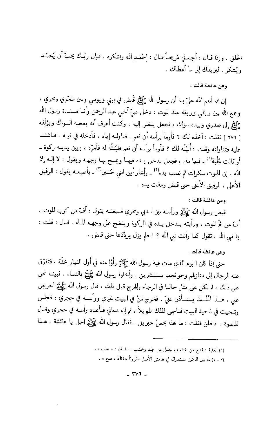 وإذا قال: أجدني مريحاً قال: أحمد الله وأشكره. فإن ربك يحب أن يحمد ويشكر، ليزيدك إلى ما أعطاك. وعن عائشة قالت: إن مما أنعم الله علي به أن رسول الله صَلَّى اللهُ عَلَيْهِ وَسَلَّمَ قبض في بيتي ويومي وبين سحري ونحري، وجمع الله بين ريقي وريقه عند الموت: دخل علي أخي عبد الرحمن وأنا مسند رسول الله صَلَّى اللهُ عَلَيْهِ وَسَلَّمَ إلى صدري وبيده سواك، فجعل ينظر إليه، وكنت أعلم أنه يعجبه السواك ويؤلفه فقلت آخذه لك؟ فأومأ برأسه أن نعم. فناولته إياه، فأدخله في فيه. فاشتد عليه فتناولته وقلت ألينه لك؟ فأومأ برأسه أن نعم فلينته له فأمره، وبين يديه ركوة - أو قالت علبة فيها ماء، فجعل يدخل يده فيها ويمسح بها وجهه ويقول: لا إله إلا الله إن للموت سكرات ثم نصب يده - وشار أين أبني حسين - بأصبعه يقول الرفيق الأعلى، الرفيق الأعلى حتى فبض ومالت يده. وعن عائشة قالت: قبض رسول الله صَلَّى اللهُ عَلَيْهِ وَسَلَّمَ ورأسه بين ثديي ونحري فسمعته يقول: أف من كرب الموت. أف من غم الموت، ورأيته يدخل يده في الركوة وينضح على وجهه الماء. قال: قلت: يا نبي الله، تقول كذا وأنت نبي الله! فلم يزل يرددها حتى قبض. وعن عائشة قالت: حتى إذا كان اليوم الذي مات فيه رسول الله صَلَّى اللهُ عَلَيْهِ وَسَلَّمَ رأو منه في أول النهار خفة، فتقرق عنه الرجال إلى منازلهم وحوائجهم مستشبرين، وأخلوا رسول الله صَلَّى اللهُ عَلَيْهِ وَسَلَّمَ بالنساء. فبينا نحن على ذلك، لم نكن على مثل حالنا في الرجاء والهزج قبل ذلك، قال الرسول صَلَّى اللهُ عَلَيْهِ وَسَلَّمَ اخرجن عني هذا الملك يستأذن علي، فخرج من في البيت غيري ورأسه في حجري، فجلس وتنحيت في ناحية البيت فناجى الملك طويلاً، ثم إنه دعاني فأعاد رأسه في حجري وقال للنسوة: ادخلن فقلت: ما هذا بحس جبريل. فقال رسول الله صَلَّى اللهُ عَلَيْهِ وَسَلَّمَ أجل يا عائشة. هذا