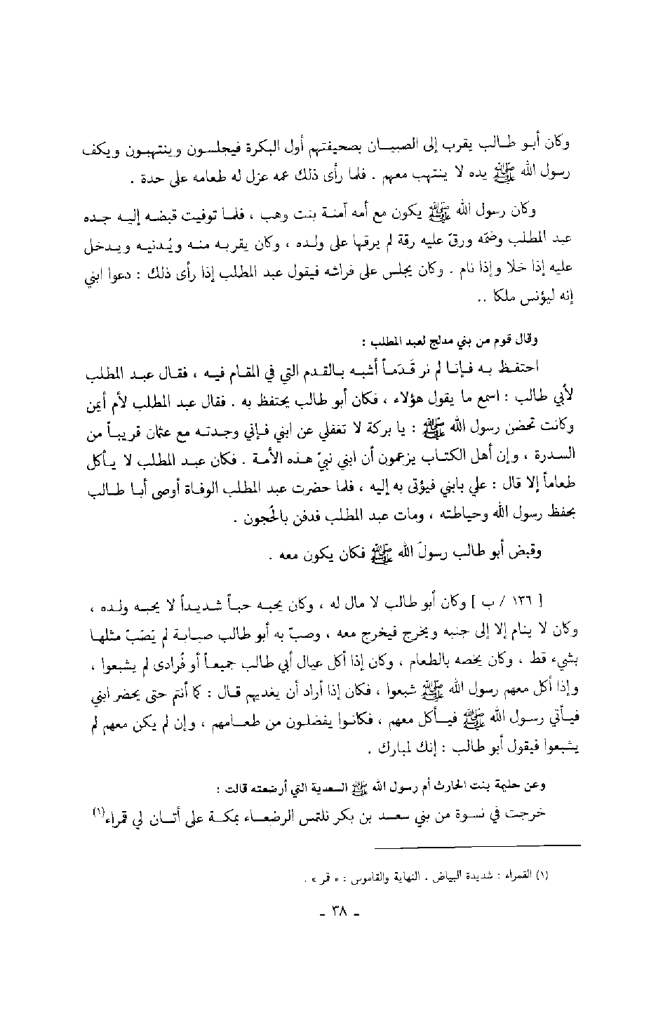 وقال قوم من بني مدلج لعبد المطلب: احتفظ به فإنا لم نر قدماً أشبه بالقدم التي في المقام فيه، فقال عبد المطلب لأبي طالب: اسمع ما يقول هؤلاء، فكان أبو طالب يحتفظ به. فقال عبد المطلب لأم أيمن وكانت تحضن رسول الله صَلَّى اللهُ عَلَيْهِ وَسَلَّمَ: يا بركة لا تغفلي عن ابني فإني وجدته مع عثمان قريباً من السدرة، وإن أهل الكتاب يزعمون أن ابني نبي هذه الأمة. فكان عبد المطلب لا يأكل طعاماً إلا قال: علي بابني فيؤتى به إليه، فلما حضرت عبد المطلب الوفاة أوصى أبا طالب بحفظ رسول الله صَلَّى اللهُ عَلَيْهِ وَسَلَّمَ وحياطته، ومات عبد المطلب فدفن بالحجون.