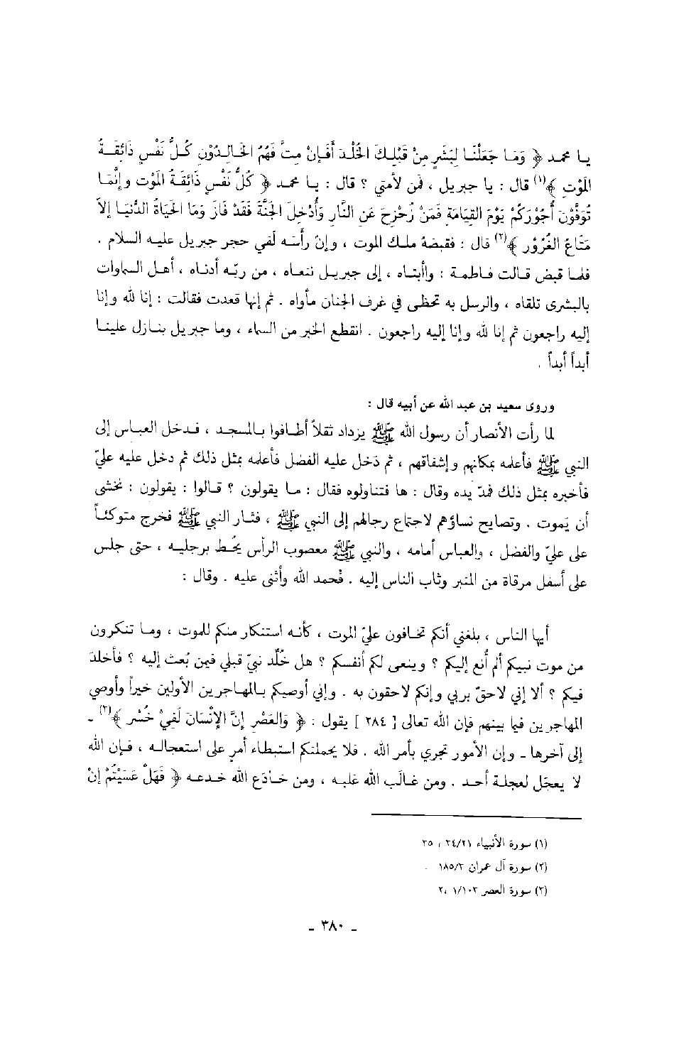 يا محمد " وما جعلنا لبشر من قبلك الخلد أفإن مت فهم الخالدون كل نفس ذائقة الموت " قال: يا جبريل فمن لأمتي؟ قال: يا محمد " كل نفس ذائقة الموت وإنما نوفون أجوركم يوم القيامة فمن زحزح عن النار وأدخل الجنة فقد فاز وما الحياة الدنيا إلا متاع الغرور " قال: فقبضه ملك الموت، وإن رأسه لفي حجر جبريل عليه السلام. فلما قبضه قالت فاطمة: واأبتاه، إلى جبريل ننعاه، من ربه أدناه، أهل السموات بالبشرى تلقاه، والرسل به تحظى وفي الجنان مأواه. ثم إنها قعدت فقالت: إنا لله وإنا إليه راجعون ثم إنا لله وإنا إليه راجعون. انقطع الخبر من السماء، وما جبريل بنازل علينا أبداً أبداً. وروى أبو سعيد بن عبد الله عن أبيه قال: لما رأت الأنصار أن رسول الله صَلَّى اللهُ عَلَيْهِ وَسَلَّمَ يزداد ثقلاً أطافوا بالمسجد، فدخل العباس إلى النبي صَلَّى اللهُ عَلَيْهِ وَسَلَّمَ فأعلمه بمكانهم وإشفاقهم، ثم دخل عليه الفضل فأعلمه بمثل ذلك ثم دخل عليه علي فأخبره بمثل ذلك فمد يده وقال: ها فتناوله فقال: ما يقولون؟ قالوا: يقولون: نخشى أن يموت، وتصايح نساؤهم لإجتماع رجالهم إلى النبي صَلَّى اللهُ عَلَيْهِ وَسَلَّمَ، فثار النبي صَلَّى اللهُ عَلَيْهِ وَسَلَّمَ فخرج متوكئاً على علي والفضل، والعباس أمامه، والنبي صَلَّى اللهُ عَلَيْهِ وَسَلَّمَ معصوب الرأس يحط برجليه، حتى جلس على أسفل مرقاة من المنبر وثاب الناس إليه. فحمد الله واثنى عليه.: فأقبلا جميعاً حتى دخلا عليه، فسلما فقال رسول الله صَلَّى اللهُ عَلَيْهِ وَسَلَّمَ: يا جبريل، ما بد من الموت؟ قال: يا محمد " وما جعلنا لبشر من قبلك الخلد أفإن مت فهم الخالدون كل نفس ذائقة الموت " قال: يا جبريل فمن لأمتي؟ قال: يا محمد " كل نفس ذائقة الموت وإنما نوفون أجوركم يوم القيامة فمن زحزح عن النار وأدخل الجنة فقد فاز وما الحياة الدنيا إلا متاع الغرور " قال: فقبضه ملك الموت، وإن رأسه لفي حجر جبريل عليه السلام. فلما قبضه قالت فاطمة: واأبتاه، إلى جبريل ننعاه، من ربه أدناه، أهل السموات بالبشرى تلقاه، والرسل به تحظى وفي الجنان مأواه. ثم إنها قعدت فقالت: إنا لله وإنا إليه راجعون ثم إنا لله وإنا إليه راجعون. انقطع الخبر من السماء، وما جبريل بنازل علينا أبداً أبداً. وروى أبو سعيد بن عبد الله عن أبيه قال: لما رأت الأنصار أن رسول الله صَلَّى اللهُ عَلَيْهِ وَسَلَّمَ يزداد ثقلاً أطافوا بالمسجد، فدخل العباس إلى النبي صَلَّى اللهُ عَلَيْهِ وَسَلَّمَ فأعلمه بمكانهم وإشفاقهم، ثم دخل عليه الفضل فأعلمه بمثل ذلك ثم دخل عليه علي فأخبره بمثل ذلك فمد يده وقال: ها فتناوله فقال: ما يقولون؟ قالوا: يقولون: نخشى أن يموت، وتصايح نساؤهم لإجتماع رجالهم إلى النبي صَلَّى اللهُ عَلَيْهِ وَسَلَّمَ، فثار النبي صَلَّى اللهُ عَلَيْهِ وَسَلَّمَ فخرج متوكئاً على علي والفضل، والعباس أمامه، والنبي صَلَّى اللهُ عَلَيْهِ وَسَلَّمَ معصوب الرأس يحط برجليه، حتى جلس على أسفل مرقاة من المنبر وثاب الناس إليه. فحمد الله واثنى عليه.