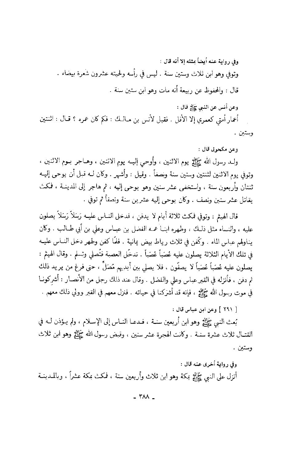 وفي رواية عنه أيضاً بمثله ولا أنه قال: وتوفي وهو ابن ثلاث وستين سنة، ليس في رأسه ولحيته عشرون شعرة بيضاء. قال: والمحفوظ عن ربيعة أنه مات وهو ابن ستين سنة. وعن أنس عن النبي صَلَّى اللهُ عَلَيْهِ وَسَلَّمَ قال: أعمار أمتي كعمري إلا الأقل. فقيل لأنس بن مالك: فكم كان عمره؟ قال: اثنين وستين. وعن مكحول قال: ولد رسول الله صَلَّى اللهُ عَلَيْهِ وَسَلَّمَ يوم الإثنين، وأوحي إليه يوم الإثنين، وهاجر يوم الإثنين، وتوفي يوم الإثنين لثنتين وستين سنة ونصفاً. وقيل وأشهر. وكان له قبل أن يوحى إليه ثنتان وأربعون سنة، واستخفى عشر سنين وهو يوحى إليه، ثم هاجر إلى المدينة، فمكث يقاتل عشر سنين ونصف. وكان يوحى إليه عشرين سنة ونصفاً ثم توفي. قال الهيثم: وتوفي فمكث ثلاثة أيام لا يدفن، فدخل الناس عليه رسلاً رسلاً يصلون عليه، والنساء مثل ذلك، وطهره أبنا عمه الفضل بن عباس وعلي بن أبي طالب. وكان يناولهم عباس الماء. وكفن في ثلاث رياط بيض يمانية. فلما كفن وطهر دخل الناس عليه في تلك الأيام الثلاثة يصلون عليه عصباً عصباً. تدخل العصبة فتصلي وتسلم. وقال الهيثم: يصلون عليه عصبا عصبا لا يصفون، فلا يصلي بين أيديهم مصل، حتى فرغ من يريد ذلك ثم دفن، فأنزله في القبر عباس وعلي والفضل. وقال عند ذلك رجل من الأنصار: أشركونا في موت رسول الله صَلَّى اللهُ عَلَيْهِ وَسَلَّمَ، فإنه قد أشركنا في حياته. فنزل معهم في القبر وولي ذلك معهم. وعن ابن عباس قال: بعث النبي صَلَّى اللهُ عَلَيْهِ وَسَلَّمَ وهو ابن أربعين سنة، فدعا الناس إلى الإسلام، ولم يؤذن له في القتال ثلاث عشرة سنة. وكانت الهجرة عشر سنين، وقبض رسول الله صَلَّى اللهُ عَلَيْهِ وَسَلَّمَ وهو ابن ثلاث وستين. وفي رواية أخرى عنه قال: أنزل على النبي صَلَّى اللهُ عَلَيْهِ وَسَلَّمَ بمكة وهو ابن ثلاث وأربعين سنة، فمكث بمكة عشراً، وبالمدينة