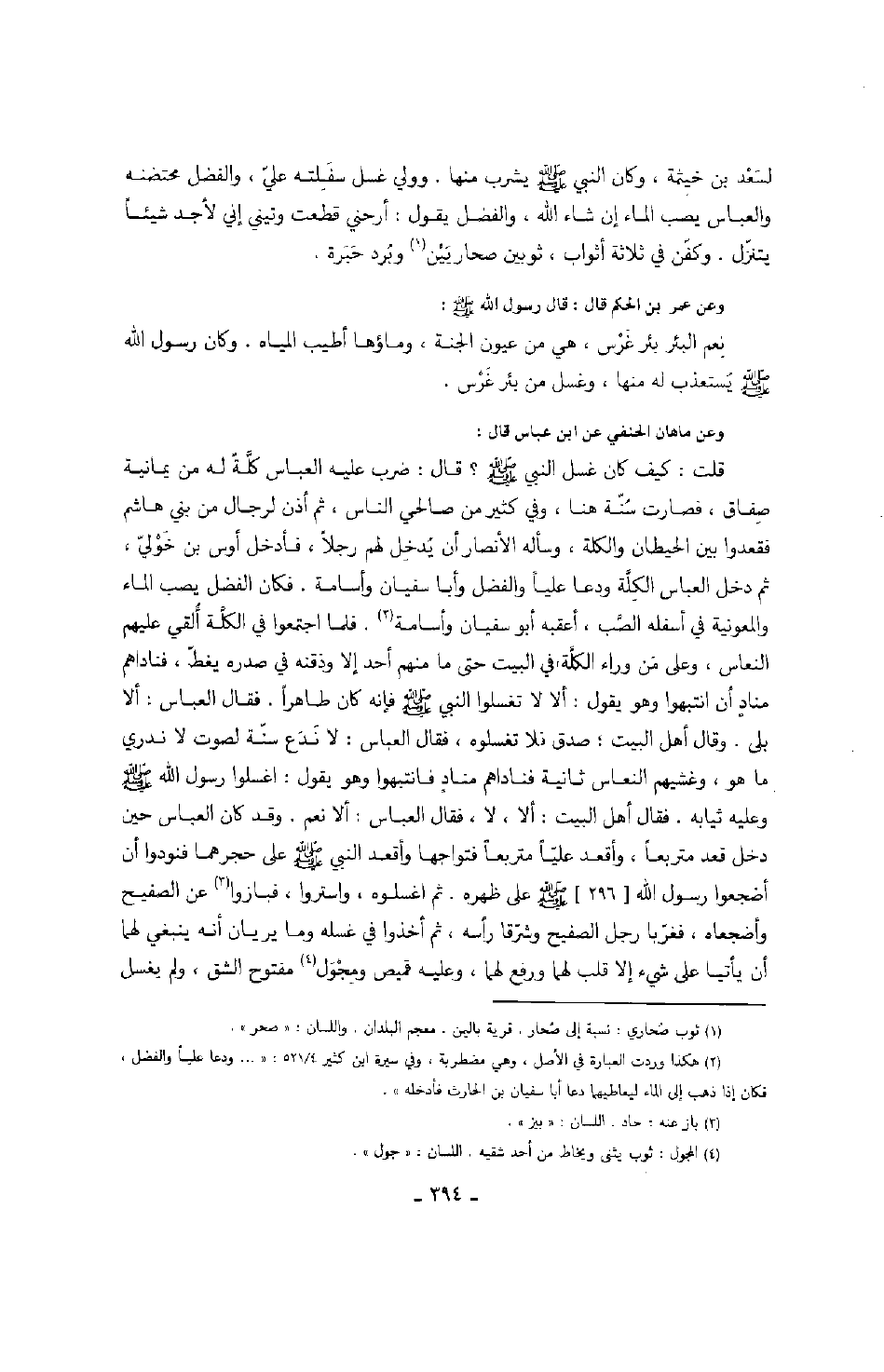 لسعد بن خثيمة، وكان النبي صَلَّى اللهُ عَلَيْهِ وَسَلَّمَ يشرب منها. وولي غسل سفلته علي، والفضل محتضنه والعباس يصب الماء إن شاء الله أرحني قطعت وتيني إني لأجد شيئاً يتنزل. وكفن في ثلاثة أثواب، ثوبين صحاريين وبرد حبرة. وعن عمر بن الحكم قال: قال رسول الله صَلَّى اللهُ عَلَيْهِ وَسَلَّمَ: " نعم الئر بئر غرس، هي من عيون الجنة، وماؤها أطيب المياه. وكان رسول الله صَلَّى اللهُ عَلَيْهِ وَسَلَّمَ يستعذب له منها، وغسل من بئر غرس. وعن ماها ن الحنفي عن ابن عباس قال: قلت كيف كان غسل النبي صَلَّى اللهُ عَلَيْهِ وَسَلَّمَ؟ قال: ضرب عليه العباس كلة له من يمانيةصفاق، فصارت سنة هنا، وفي كثير من صالحي الناس، ثمن أذن لرجال من بني هاشم فقعدوا بين الحيطان والكلة، وسأله الأنصار أن يدخل لهم رجلاً، فأدخل أوس بن خولي ثم دخل العباس الكلة ودعا علياً والفضل وأبا سفيان وأسامة. فلما أجتمعوا في الكلة ألقي عليهم النعاس، وعلى من وراء الكلة في البيت حتى ما منهم أحد إلا وذقنه في صدره يغطّ، فناداهم مناد أن أنتبهوا وهو يقول: ألا لا تغسلوا النبي صَلَّى اللهُ عَلَيْهِ وَسَلَّمَ فإنه كان طاهراً. فقال العباس: ألا بلى. وقال أهل البيت؛ صدق فلا تغسلوه، فقال العباس: لا ندع سنة لصوت لا ندري ما هو، وغشيهم النعاس ثانية فناداهم مناد فانتبهوا وهو يقول: اغسلوا رسول الله صَلَّى اللهُ عَلَيْهِ وَسَلَّمَ وعليه ثيابه. فقال أهل البيت: ألا، لا، فقال العباس: ألا نعم. وفدكان العباس حين دخل قعد متربعاً، وأقعد علي متربعاً فتواجها وأقعد النبي صَلَّى اللهُ عَلَيْهِ وَسَلَّمَ على حجرهما فنودوا أن أضجعوا رسول الله صَلَّى اللهُ عَلَيْهِ وَسَلَّمَ على ظهره. ثم أغسلوه، وأستروا، فبازوا عن الصفيح وأضجعاه، فغربا رجل الصفيح وشرقا رأسه، وثم أخذوا في غسله وما يريان أنه ينبغي لهما أن يأتيا على شيء إلا قلب لهما ورفع لهما، وعليه قميص ومجول مفتوح الشق، ولم يغسل