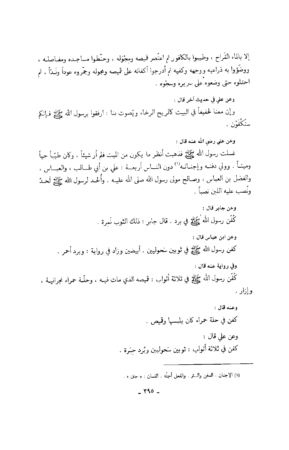 حتىوضعوه على سريره وسجوه. وعن علي في حديث آخر قال: وإن معنا لخفيف في البيت كالريح الرخاء ويصوت بنا: ارفعوا برسول الله صَلَّى اللهُ عَلَيْهِ وَسَلَّمَ فإنكم ستكفون. وعن علي رضي الله عنه قال: غسلت رسول الله صَلَّى اللهُ عَلَيْهِ وَسَلَّمَ فذهبت أنظر ما يكون من الميت فلم أر شيئاً، وكان طيباً حياً وميتاً. ولي دفنه وإجنانه دون الناس أربع: علي بن أبي طالب، والعباس، والفضل بن العباس، وصالح مولى رسول الله صَلَّى اللهُ عَلَيْهِ وَسَلَّمَ. وألحد لرسول الله صَلَّى اللهُ عَلَيْهِ وَسَلَّمَ لحد ونصب عليه اللبن نصباً. وعن جابر قال: كفن رسول الله صَلَّى اللهُ عَلَيْهِ وَسَلَّمَ في برد. قال جابر ذلك الثوب نمرة. وعن ابن عباس قال: كفن رسول الله صَلَّى اللهُ عَلَيْهِ وَسَلَّمَ في ثوبين سحوليين. أبيضين وذاد في رواية وبرد أحمر. وفي رواية عنه قال: كفن رسول الله صَلَّى اللهُ عَلَيْهِ وَسَلَّمَ في ثلاثة أثواب: قميصه الذي مات فيه، وحلة حمراء نجراتية، وإزار. وعنه قال: كفن في حلة حمراء كان يلبسها وقميص. وعن علي قال: كفن في ثلاثة أثواب: ثوبيين سحوليين وبرد حبرة.