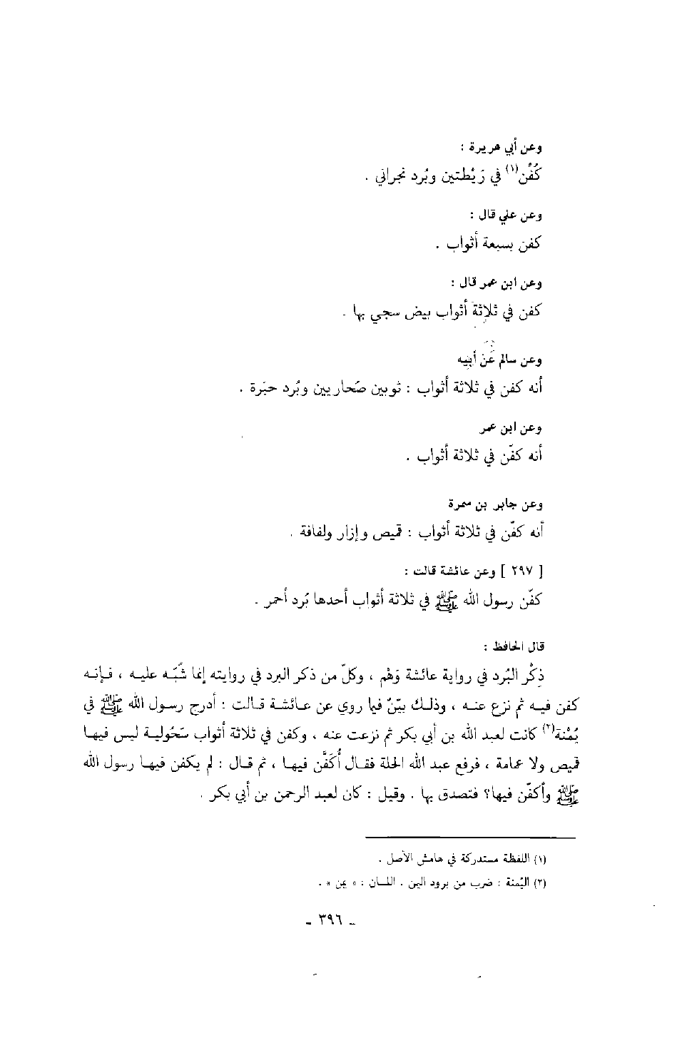 وعن أبي هريرة: كفن في ريطتين وبرد نجراني. وعن علي قال: كفن بسبعة أثواب. وعن ابن عمر قال: كفن في ثلاثة أثواب بيض سجي بها. وعن سالم عن أبيه أنه كفن في ثلاثة أثواب: ثوبين صحاريين وبرد حبرة. وعن ابن عمر أنه كفن في ثلاثة أثواب. وعن جابر بن سمرة أنه كفن في ثلاثة أثواب: قميص وإزار ولفافة. على سريره وسجوه. وعن علي في حديث آخر قال: وإن معنا لخفيف في البيت كالريح الرخاء ويصوت بنا: ارفعوا برسول الله صَلَّى اللهُ عَلَيْهِ وَسَلَّمَ فإنكم ستكفون. وعن علي رضي الله عنه قال: غسلت رسول الله صَلَّى اللهُ عَلَيْهِ وَسَلَّمَ فذهبت أنظر ما يكون من الميت فلم أر شيئاً، وكان طيباً حياً وميتاً. ولي دفنه وإجنانه دون الناس أربع: علي بن أبي طالب، والعباس، والفضل بن العباس، وصالح مولى رسول الله صَلَّى اللهُ عَلَيْهِ وَسَلَّمَ. وألحد لرسول الله صَلَّى اللهُ عَلَيْهِ وَسَلَّمَ لحد ونصب عليه اللبن نصباً. وعن جابر قال: كفن رسول الله صَلَّى اللهُ عَلَيْهِ وَسَلَّمَ في برد. قال جابر ذلك الثوب نمرة. وعن ابن عباس قال: كفن رسول الله صَلَّى اللهُ عَلَيْهِ وَسَلَّمَ في ثوبين سحوليين. أبيضين وذاد في رواية وبرد أحمر. وفي رواية عنه قال: كفن رسول الله صَلَّى اللهُ عَلَيْهِ وَسَلَّمَ في ثلاثة أثواب: قميصه الذي مات فيه، وحلة حمراء نجراتية، وإزار. وعنه قال: كفن في حلة حمراء كان يلبسها وقميص. وعن علي قال: كفن في ثلاثة أثواب: ثوبيين سحوليين وبرد حبرة. وعن أبي هريرة: كفن في ريطتين وبرد نجراني. وعن علي قال: كفن بسبعة أثواب. وعن ابن عمر قال: كفن في ثلاثة أثواب بيض سجي بها. وعن سالم عن أبيه أنه كفن في ثلاثة أثواب: ثوبين صحاريين وبرد حبرة. وعن ابن عمر أنه كفن في ثلاثة أثواب. وعن جابر بن سمرة أنه كفن في ثلاثة أثواب: قميص وإزار ولفافة.