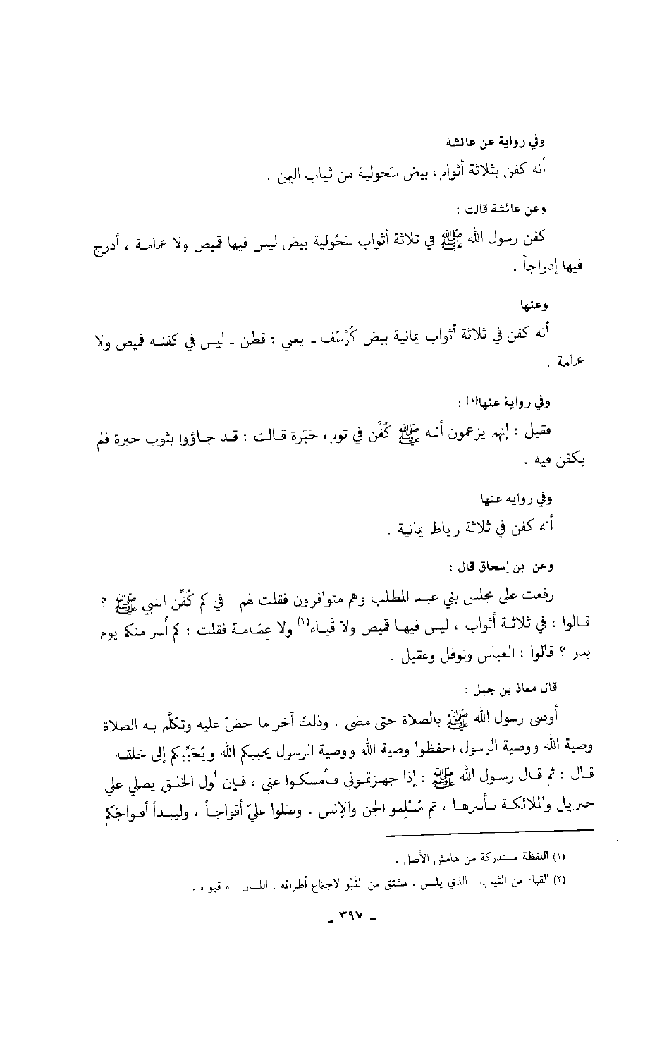 وفي رواية عن عائشة أنه كفن بثلاثة أثواب بيض سحولية من ثياب اليمن. وعن عائشة قالت: كفن رسول الله صَلَّى اللهُ عَلَيْهِ وَسَلَّمَ في ثلاث أثواب سحولية بيض ليس فيها قميص ولا عمامة، أدرج فها إدراجاً. وعنها أنه كفن في ثلاثة أثواب يمانية بيض كرسف - يعني: قطن - ليس في كفنه قميص ولا عمامة. وفي رواية عنها: فقيل: إنهم يزعمون أنه صَلَّى اللهُ عَلَيْهِ وَسَلَّمَ كفن في ثوب حبرة قالت: قد جاؤوا بثوب حبرة فلم يكفن فيه. وفي رواية عنها أنه كفن في ثلاثة رياط يمانية. وعن ابن إسحاق قال: رفعت على مجلس بني عبد المطلب وهم متوافرون فقلت لهم: في كم كفن النبي صَلَّى اللهُ عَلَيْهِ وَسَلَّمَ قالوا: في ثلاثة أثواب، ليس قيها قميص ولا قباء ولا عمامة فقلت: كم أسر منكم يوم بدر؟ قالوا: العباس ونوفل وعقيل. قال معاذ بن جبل: أوصى رسول الله صَلَّى اللهُ عَلَيْهِ وَسَلَّمَ بالصلاة حتى مضى. وذلك آخر ما حض عليه وتكلم به الصلاة وصية الله ووصية الرسول احفظوا وصية الله ووصية الرسول يحببكم الله ويحببكم إلى خلقه. قال: ثم قال رسول الله صَلَّى اللهُ عَلَيْهِ وَسَلَّمَ: إذا جهزتموني فأمسكوا عني، فإن أول الخلق يصلي علي جبريل والملائكة بأسرها، ثم مسلم والجن والأنس، وصلوا علي أفواجاً، وليبدأ أفواجكم