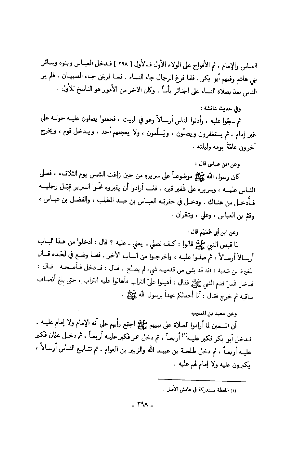 العباس والإمام، ثم الأفواج على الولاء الأول فالأول فدخل العباس وبنوه وسائر بني هاشم وفيهم أبو بكر. فلما فرغ الرجال جاء النساء. فلما فرغن جاء الصبيان. فلم ير الناس بعد بصلاة النساء على الجنائز بأساً. وكان الآخرون من الأمور هو الناسخ الأول. وفي حديث عائشة: ثم سجوا عليه وادنوا الناس أرسالا وهو في البيت، فجعلوا يصلون عليه حوله على غير إمام، ثم يستغفرون ويصلون، ويسلم ون، ولا يعجلهم أحد، ويدخل قوم، ويخرج آخرون عامة يومه وليلته. وعن ابن عباس قال: كان رسول الله صَلَّى اللهُ عَلَيْهِ وَسَلَّمَ موضوعاً على سريره من حين زاغت الشمس يوم الثلاثاء، فصلى الناس عليه، وسريره على شفير قبره. فلما أرادوا أن يقبروه نحوا السرير قبل رجليه فأدخل من هناك. ودخل في حفرته العباس بن عبد المطلب، والفضل بن عباس، وقثم بن العباس، وعلي، وشقران. وعن ابن أبي عسيم قال: لما قبض النبي صَلَّى اللهُ عَلَيْهِ وَسَلَّمَ قالوا: كيف نصلي - يعني - عليه؟ قال: ادخلوا من هذا الباب أرسالاً أرسالاً، ثم صلوا عليه، وأخرجوا من الباب الآخر. فلما وضع في لحده قال المغيرة ببن شعبة: إنه بقي شيء من قدميه لم يصلح. قال: فادحل فاصلحه. قال: فدخل فمس قدم النبي صَلَّى اللهُ عَلَيْهِ وَسَلَّمَ فقال: أهيلوا علي التراب فأهالوا عليه التراب، حتى بلغ أنصاف ساقيه ثم خرج فقال: أنا أحدثم عهداً برسول صَلَّى اللهُ عَلَيْهِ وَسَلَّمَ الله. وعن سعيد بن المسيب أن المسلمين لما أرادوا الصلاة على نبيهم صَلَّى اللهُ عَلَيْهِ وَسَلَّمَ اجتمع رأيهم على أنه الإمام ولا إمام عليه. فدخل أبو بكر فكبر عليه أربعاً، ثم دخل عمر فكبر عليه أربعاً، ثم دخل عثمان فكبر عليه أربعاً، ثم دخل طلحة بن عبد الله والزبير بن العوام، ثم تتابع الناس أرسالاً، يكبرون عليه ولا إمام لهم عليه.