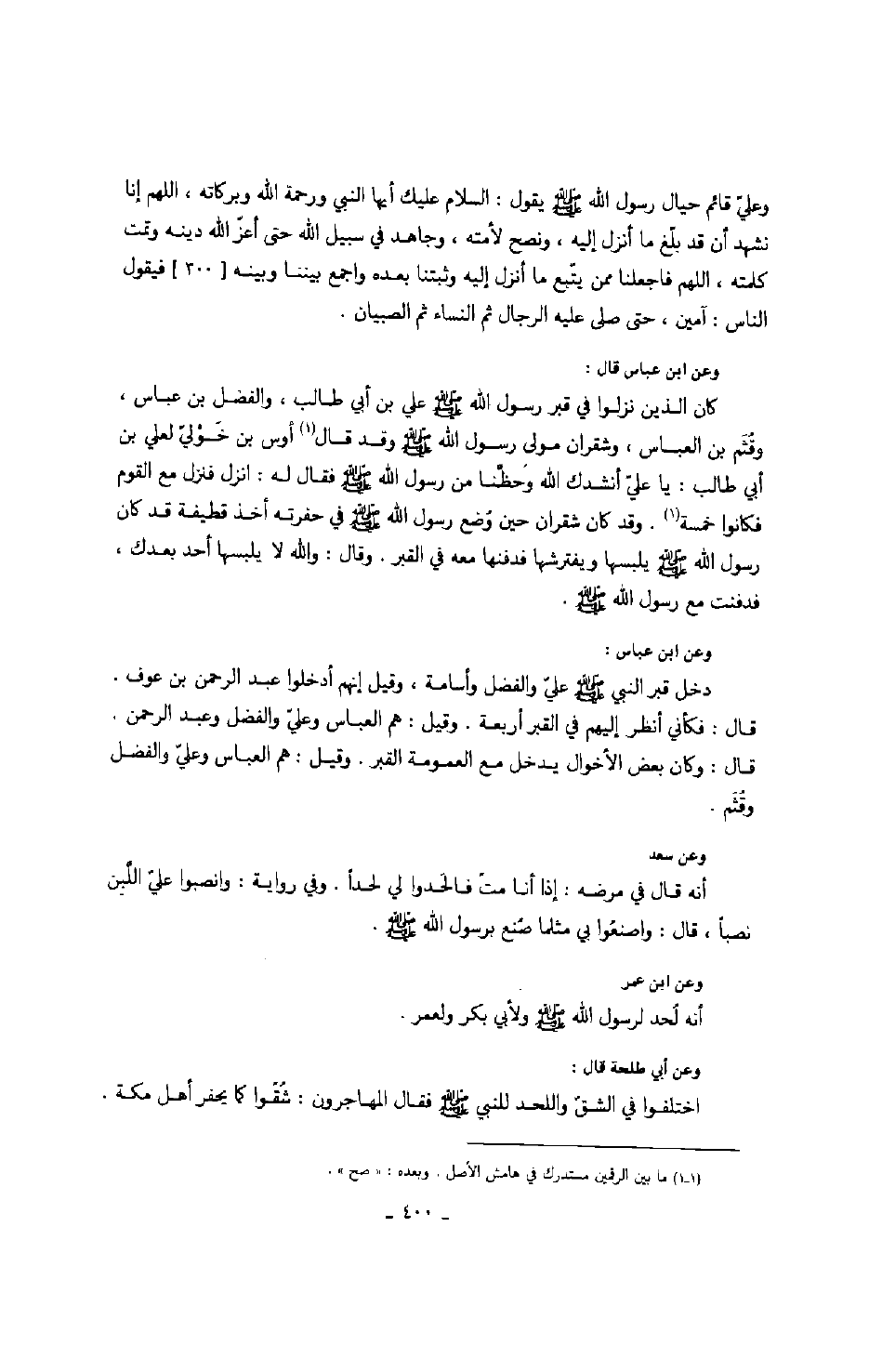 وعلي قائم حيال رسول الله صَلَّى اللهُ عَلَيْهِ وَسَلَّمَ يقول: السلام عليك أيها النبي ورحمة الله وبركاته، اللهم أنا نشهد أن قد بلغ ما أنزل إليه، ونصح لأمته، وجاهد في سبيل الله حتى أعز الله دينه وتمت كلمته، اللهم فأجعلنا ممن يتبع ما أنزل إليه وثبتنا بعده واجمع بيننا وبينه فيقول الناس: آمين، حتى صلوا عليه الرجال ثم النساء ثم الصبيان. وعن ابن عباس قال: كان الذين نزلوا في قبر رسول الله صَلَّى اللهُ عَلَيْهِ وَسَلَّمَ علي بن أبي طالب، والفضل بن عباس، وقثم بن العباس، وشقران مولى رسول الله صَلَّى اللهُ عَلَيْهِ وَسَلَّمَ وقد قال أوس بن خولي لعلي بن أبي طالب: يا علي أنشدك الله وحظنا من رسول الله صَلَّى اللهُ عَلَيْهِ وَسَلَّمَ فقال له: انزل فنزل مع القوم فكانوا خمسة. وقد كان شقران حين وضع رسول الله صَلَّى اللهُ عَلَيْهِ وَسَلَّمَ في حفرته أخذ قطيفة قد كان رسول الله صَلَّى اللهُ عَلَيْهِ وَسَلَّمَ يلبسها ويفترشها فدفنها معه في القبر. وقال: والله لا يلبسها أحد بعدك، فدفنت مع رسول الله صَلَّى اللهُ عَلَيْهِ وَسَلَّمَ. وعن ابن عباس: دخل قبر النبي صَلَّى اللهُ عَلَيْهِ وَسَلَّمَ علي والفضل وأسامة، وقيل أنهم أدخلوا عبد الرحمن بن عوف. قال: فكأني أنظر إليهم في القبر أربعة. وقيل: هم العباس وعلي والفضل وعبد الرحمن. قال: وكان بعض الأخوال يدخل مع العمومة القبر. وقيل: هم العباس وعلي والفضل وقثم. وعن سعد أنه قال في مرضه: إذا أنا مت فألحدوا لي لحداً. وفي رواية: وانصبوا علي اللبن نصباً، قال: واصنعوا بي مثلما صنع برسول الله صَلَّى اللهُ عَلَيْهِ وَسَلَّمَ. وعن ابن عمر أنه لحد لرسول الله صَلَّى اللهُ عَلَيْهِ وَسَلَّمَ ولأبي بكر ولعمر. تميمي، قال: وجدت هذا في صحيفة خط أبي فيها: لما كفن النبي صَلَّى اللهُ عَلَيْهِ وَسَلَّمَ ووضع على سريره دخل أبو بكر وعمر فقالا: السلام عليك أيها النبي ورحمة الله وبركاته، ومعهما نفر من المهاجرين والأنصار قدر ما يسع البيت، فسلم وا كما سلم أبو بكر وعمر، وصفوا صفوفاً لا يومئهم عليه أحد، فقال أبو بكر وعمر وهما في الصف الأول حيال رسول الله صَلَّى اللهُ عَلَيْهِ وَسَلَّمَ: اللهم إنا نشهد أن قد بلغ ما أنزل عليه، ونصح لأمته، وجاهد في سبيل الله حتى أعز الله دينه، وتمت كلماته، فأومن به وحده لا شريك له، فاجعلنا ياإلهنا ممن يتبع القول الذي أنزل معه، واجمع بيننا وبينه حتى يعرفنا ونعرفه بنا فإن كان بالمؤمنين رؤوفاً رحيماً، لا نبغي بالإيمان بدلاً ولا نشتري به ثمناً أبداً فيقول الناس آمين آمين ثم يخرجون، ويدخل آخرون حتى صلوا عليه: الرجال ثم النساء ثم الصبيان. فلما فرغوا من الصلاة تكلموا في موضع قبره. وعن علي قال: لما وضع رسول الله صَلَّى اللهُ عَلَيْهِ وَسَلَّمَ على السرير قال علي: لا يقوم عليه أحد هو إمامكم حياً وميتاً، فكان يدخل الناس رسلاً رسلاً فيصلون عليه صفاً صفاً ليس لهم إمام، ويكبرون وعلي قائم حيال رسول الله صَلَّى اللهُ عَلَيْهِ وَسَلَّمَ يقول: السلام عليك أيها النبي ورحمة الله وبركاته، اللهم أنا نشهد أن قد بلغ ما أنزل إليه، ونصح لأمته، وجاهد في سبيل الله حتى أعز الله دينه وتمت كلمته، اللهم فأجعلنا ممن يتبع ما أنزل إليه وثبتنا بعده واجمع بيننا وبينه فيقول الناس: آمين، حتى صلوا عليه الرجال ثم النساء ثم الصبيان. وعن ابن عباس قال: كان الذين نزلوا في قبر رسول الله صَلَّى اللهُ عَلَيْهِ وَسَلَّمَ علي بن أبي طالب، والفضل بن عباس، وقثم بن العباس، وشقران مولى رسول الله صَلَّى اللهُ عَلَيْهِ وَسَلَّمَ وقد قال أوس بن خولي لعلي بن أبي طالب: يا علي أنشدك الله وحظنا من رسول الله صَلَّى اللهُ عَلَيْهِ وَسَلَّمَ فقال له: انزل فنزل مع القوم فكانوا خمسة. وقد كان شقران حين وضع رسول الله صَلَّى اللهُ عَلَيْهِ وَسَلَّمَ في حفرته أخذ قطيفة قد كان رسول الله صَلَّى اللهُ عَلَيْهِ وَسَلَّمَ يلبسها ويفترشها فدفنها معه في القبر. وقال: والله لا يلبسها أحد بعدك، فدفنت مع رسول الله صَلَّى الله