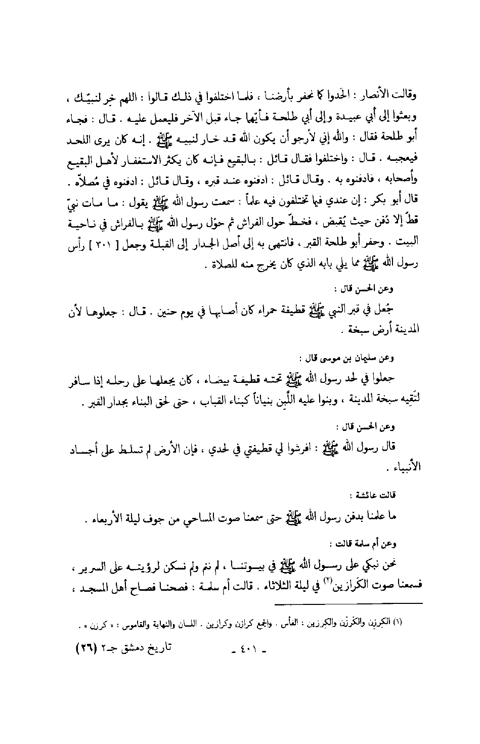 وقالت الأنصار: ألحدوا كما نحفر بأرضنا، فلما أختلفوا في ذلك قالوا: اللهم خر لنبيك، وبعثوا إلى أبي عبيدة وإلى أبي طلحة فأيهما جاء قبل فليعمل عليه. قال: فجاء أبو طلحة فقال: والله إني لأرجو أن يكون الله قد خار لنبيه صَلَّى اللهُ عَلَيْهِ وَسَلَّمَ. إنه كان يرى اللحد فيعجبه. قال: وأختلفوا فقال قائل: بالبقيع فإنه كان يكثر الإستغفار لأهل البقيع وأصحابه، فادفنوه به، قال قائل: ادفنوه عند قبره، وقال قائل: ادفنوه في مصلاه، قال أبو بكر إن عندي فيما تختلفون فيه علماً: سمعت رسول الله صَلَّى اللهُ عَلَيْهِ وَسَلَّمَ يقول: ما مات نبي قط إلا دفن حيث يقبض، فخط حول الفراش ثم حول رسول الله صَلَّى اللهُ عَلَيْهِ وَسَلَّمَ بالفراش في ناحية البيت. وحفر أبو طلحة القبر، فانتهى به إلى أصل الجدار إلى القبلة وجعل رأس رسول الله صَلَّى اللهُ عَلَيْهِ وَسَلَّمَ مما يلي بابه الذي كان يخرج منه للصلاة. وعن الحسن قال: جعل في قبر النبي صَلَّى اللهُ عَلَيْهِ وَسَلَّمَ قطيفة حمراء كان أصابها في يوم حنين. قال: جعلوها لأن المدينة أرض سبخة. وعن سليمان بن موسى قال: جعلوا في لحد رسول الله صَلَّى اللهُ عَلَيْهِ وَسَلَّمَ تحته قطيفة بيضاء، كان يجعلها على رحله إذا سافر لتقيه سبخة المدينة، وبنوا عليه اللبن بنياناً كبناء القباب، حتى لحق البناء بجدار القبر. وعن الحسن قال: قال رسول الله صَلَّى اللهُ عَلَيْهِ وَسَلَّمَ: افرشوا لي قطيفتي في لحدي، فإن الأرض لم تسلط على أجساد الأنبياء. قالت عائشة: ما علمنا بدفن رسول الله صَلَّى اللهُ عَلَيْهِ وَسَلَّمَ حتى سمعنا صوت المساحي من جوف ليلة الأربعاء. وعن أم سلمة قالت: نحن نبكي على رسول الله صَلَّى اللهُ عَلَيْهِ وَسَلَّمَ في بيوتنا، لم ننم ولم نسكن لرؤيته على السرير، فسمعنا صوت الكرازين في ليلة الثلاثاء. قالت أم سلمة: فصحنا فصاح أهل المسجد،