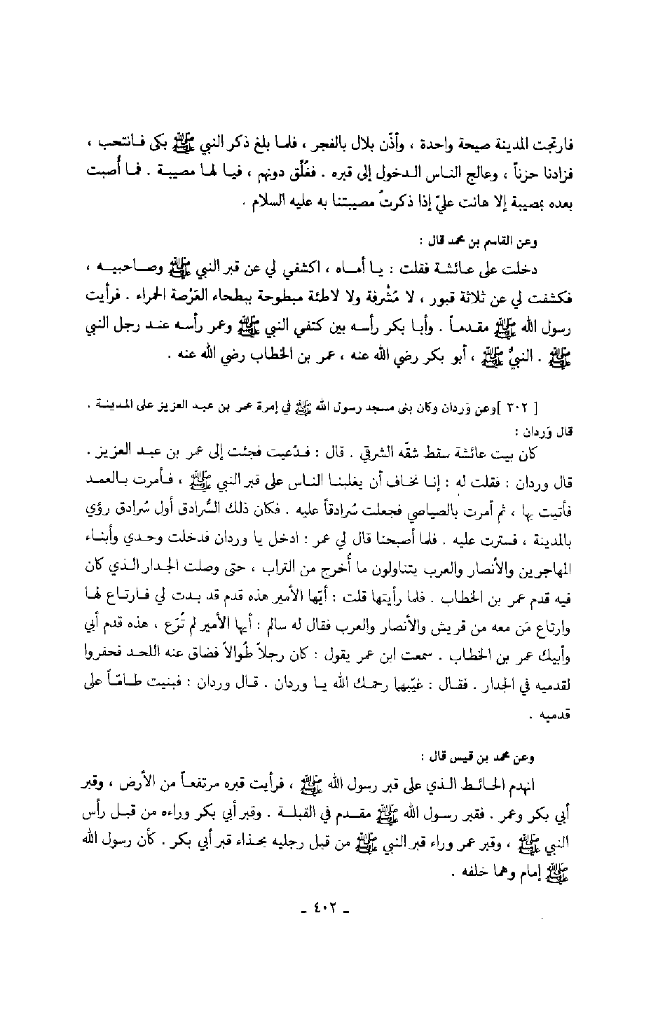 فارتجت المدينة صيحة واحدة، وأذن بلال بالفجر، فلما بلغ ذكر النبي صَلَّى اللهُ عَلَيْهِ وَسَلَّمَ بكى فانتحب فزادنا حزناً، وعالج الناس الدخول إلى قبره. فغلق دونهم، فيا لها مصيبة. فما أصبت بعده بمصيبة إلا هانت علي إذا ذكرت مصيبتنا به عليه السلام. وعن القاسم بن محمد قال: دخلت على عائشة فقلت: يا أماه أكشفي لي عن قبر رسول الله صَلَّى اللهُ عَلَيْهِ وَسَلَّمَ وصاحبيه، فكشفت لي عن ثلاثة قبور، لا مشرفة ولا لاطئة مبطوحة ببطحاء العرصة الحمراء. فرأيت رسول الله صَلَّى اللهُ عَلَيْهِ وَسَلَّمَ مقدماً. وأبا بكر رأسه بين كتفي النبي صَلَّى اللهُ عَلَيْهِ وَسَلَّمَ وعمر رأسه عند رجل النبي صَلَّى اللهُ عَلَيْهِ وَسَلَّمَ. النبي صَلَّى اللهُ عَلَيْهِ وَسَلَّمَ، أبو بكر رضي الله عنه، عمر بن الخطاب رضي الله عنه. 0 وعن وردان وكان بنى مسجد رسول الله صَلَّى اللهُ عَلَيْهِ وَسَلَّمَ في إمرة عمر بن عبد العزيز على المدينة. قال وردان: كان بيت عاشة سقط شقه الشرقي. قال: فدعيت فجئت إلى عمر بن عبد العزيز. قال وردان: فقلت له: إنا نخاف أن يغلبنا الناس على قبر النبي صَلَّى اللهُ عَلَيْهِ وَسَلَّمَ، فأمرت بالعمد فأتيت بها، وثم أمرت بالصياصي فجعلت سرادفاً عليه. فكان ذلك السرادق أول سرادق رؤي بالمدينة فسترت عليه. فلما أصبحنا قال لي عمر: ادخل يا وردان فدخلت وحدي وأبناء المهاجرين والأنصار والعرب يتناولون ما أخرج من التراب، حتى وصلت الجدار الذي كان فيه قدم عمر بن الخطاب. فلما رأيتها قلت: أيها الأمير هذه قدم قد بدت لي فارتاع لها وارتاع من معه من قريش والأنصار والعرب فقال له سالم: أيها الأمير لم ترع، هذه قدم أبي وأبيك عمر بن الخطاب. سمعت ابن عمر يقول: كان رجل طوالاً فضاق عنه اللحد فحفروا لقدميه في الجدار. فقال: غيبها رحمك الله يا وردان.