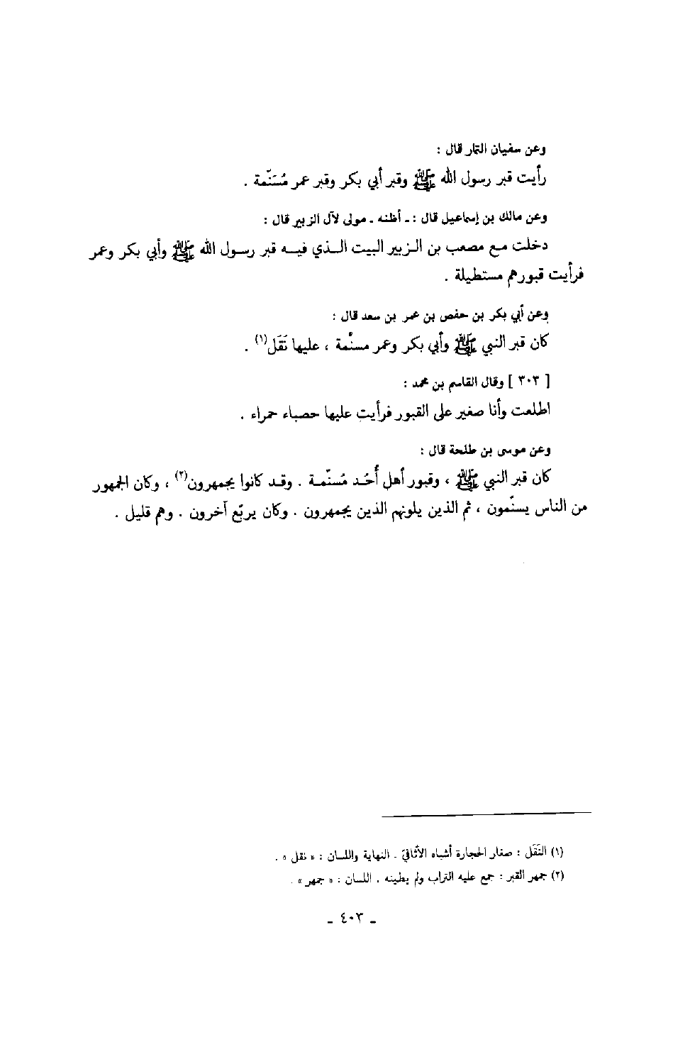 وعن سفيان التمار قال: رأيت قبر رسول الله صَلَّى اللهُ عَلَيْهِ وَسَلَّمَ وقبر أبي بكر وقبر عمر مسنمة. وعن مالك بن إسماعيل قال: - أظنه - مولى لآل الزبير قال: دخلت مع مصعب من الزبير البيت الذي فيه قبر رسول الله صَلَّى اللهُ عَلَيْهِ وَسَلَّمَ وأبي بكر وعمر فرأيت قبورهم مستطيلة. وعن أبي بكر بن حفص بن عمر بن سعد قال: كان قبر النبي صَلَّى اللهُ عَلَيْهِ وَسَلَّمَ وأبي بكر وعمر مسنمة، عليها نقل. وقال القاسم بن محمد: اطلعت وأنا صغير على القبور فرأيت عليها حصباء حمراء. وعن موسى بن طلحة قال: كان قبر النبي صَلَّى اللهُ عَلَيْهِ وَسَلَّمَ وقبور أهل أحد مسنمة. وقد كانوا يجمهرون، وكان الجمهور من الناس يسنمون، ثم الذين يلونهم الذين يجمهرون. وكان يربع آخرون. وهم قليل.