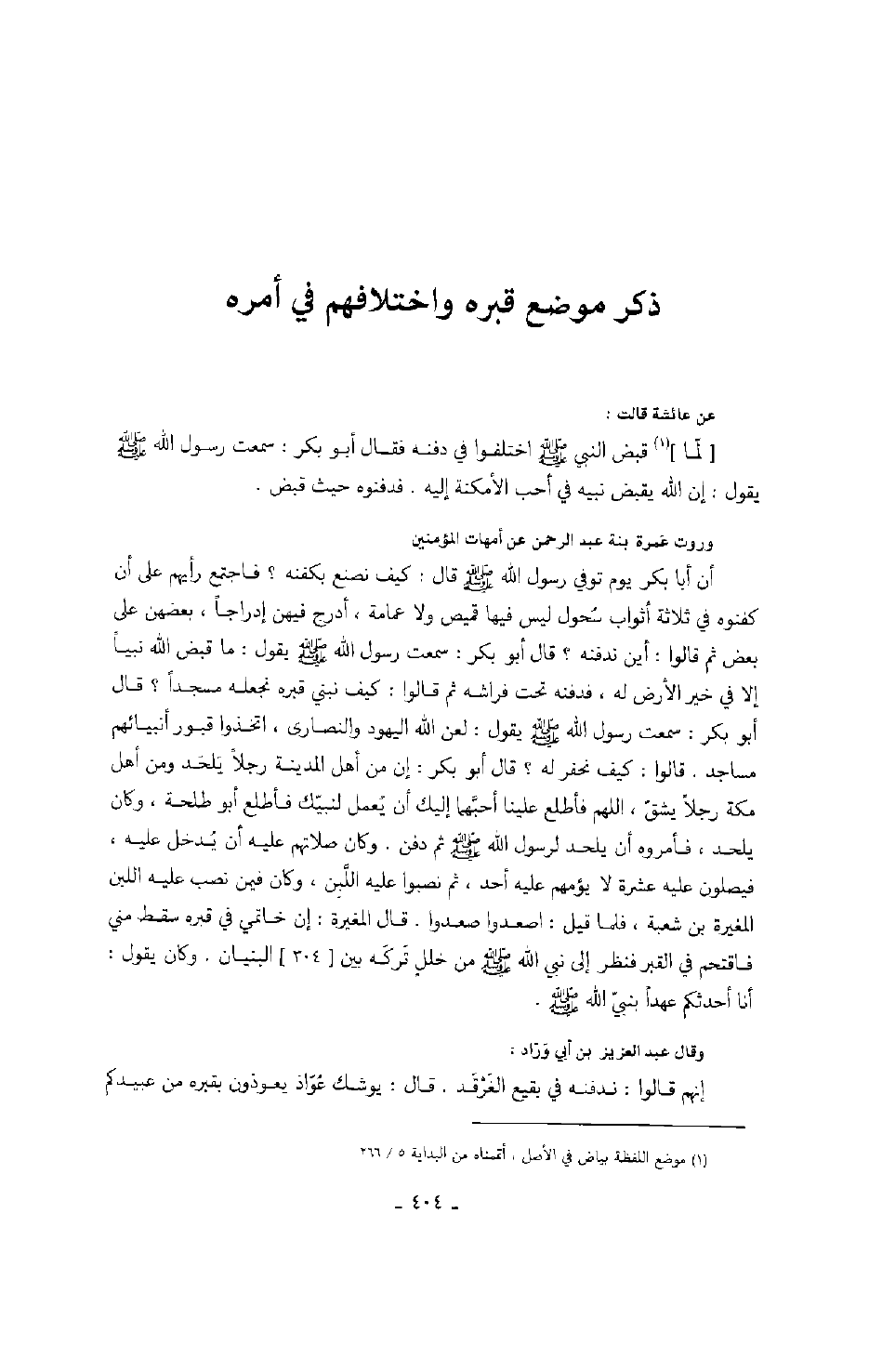 عن عائشة قالت: لما قبض النبي صَلَّى اللهُ عَلَيْهِ وَسَلَّمَ اختلفوا في دفنه فقال أبو بكر: سمعت رسول الله صَلَّى اللهُ عَلَيْهِ وَسَلَّمَ يقول: إن الله يقبض نبيه في أحب الأمكنة إليه. فدفنوه حيث قبض. وروت عمرة بنت عبد الرحمن عن أمهات المؤمنين: أن أبا بكر يوم توفي رسول الله صَلَّى اللهُ عَلَيْهِ وَسَلَّمَ قال: كيف نصنع بكفنه؟ فاجتمع رأيهم على أن كفنوه في ثلاثة أثواب سحول ليس فيها قميص ولا عمامة، أدرج فيهن إدراجاً بعضهن على بعض ثم قالوا: أين ندفنه؟ قال أبو بكر: سمعت رسول الله صَلَّى اللهُ عَلَيْهِ وَسَلَّمَ: يقول: ما قبض الله نبياًإلا في خير الأرض فدفنه تحت فراشه ثم قالوا كيف نبني قبره نجعله مسجداً؟ قال أبو بكر: سمعت رسول الله صَلَّى اللهُ عَلَيْهِ وَسَلَّمَ يقول: لعن الله اليهود والنصارى أتخذوا قبور أنبيائهم مساجد. قالوا: كيف نحفر له؟ قال أبو بكر: إن من أهل المدينة رجل يلحد، ومن أهل مكة رجل يشق، اللهم فأطلع علينا أحبهما إليك أن يعمل لنبيك فإطلع أبو طلحة، وكان يلحد، فأمروه أن يلحد لرسول الله صَلَّى اللهُ عَلَيْهِ وَسَلَّمَ ثم دفن. وكان صلاتهم عليه أن يدخل عليه، فيصلون عشرة لا يؤمهم عليه أحد، ثم نصبوا عليه اللبن، وكان فيمن نصب عليه اللبن المغيرة بن شعبة، فلما قيل: اصعدوا اصعدوا. قال المغيرة: إن خاتمي في قبره سقط مني فاقتحم في القبر فنظر إلى نبي الله صَلَّى اللهُ عَلَيْهِ وَسَلَّمَ من دخل تركه بين البنيان. وكان يقول: أنا أحدثكم عهداً بنبي الله صَلَّى اللهُ عَلَيْهِ وَسَلَّمَ. وقال عبد العزيز بن أبي وراد: إنهم قالوا ندفنه في بقيع الغرقد: قال: يوشك عواذ يعوذون بقبره من عبيدكم