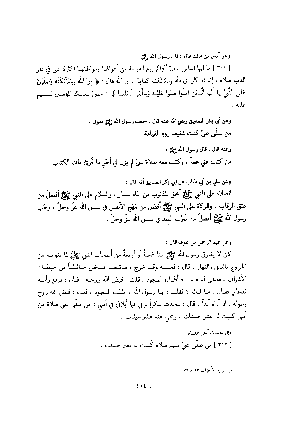 وعن أنس بن مالك قال: قال رسول الله: يا أيها الناس، إنا أنجاكم يوم القيامة من أهوالها ومواطنها أكثركم علي في دار الدنيا صلاة، إنه قد كان في الله وملائكته كفاية. إن الله قال: " إن الله وملائكته يصلون على النبي يا أيها الذين آمنوا صلوا عليه وسلم وا تسليما " خص بذلك المؤمنين ليثبتهم عليه. وعن أبي بكر الصديق رضي الله عنه قال: سمعت رسول الله صَلَّى اللهُ عَلَيْهِ وَسَلَّمَ يقول: من صلى علي كنت شفيعه يوم القيامة. وعنه قال: قال رسول الله صَلَّى اللهُ عَلَيْهِ وَسَلَّمَ: من كتب عني علماً، وكتب معه صلاة علي لم يزل في أجر ما قرئ ذلك الكتاب. وعن علي بن أبي طالب عن أبي بكر أنه قال: الصلاة على النبي صَلَّى اللهُ عَلَيْهِ وَسَلَّمَ أمحق للذنوب من الماء للنار، والسلام على النبي صَلَّى اللهُ عَلَيْهِ وَسَلَّمَ أفضل من عتق الرقاب. والزكاة على النبي أفضل من مهج الأنفس في سبيل الله عز وجل، وحب رسول الله أفضل من ضرب البيد في سبيل الله عز وجل. وعن عبد الرحمن بن عوف قال: كان لا يفارق رسول الله منا خمسة أو أربعة من أصحاب النبي صَلَّى اللهُ عَلَيْهِ وَسَلَّمَ لما ينويه من الخروج بالليل والنهار. قال: فجئته وقد خرج، فاتبعته فدخل حائطاً من حيطان الأشراف، فصلى فسجد، فأطال السجود. قلت: قبض الله روحه. قال: فرفع رأسه فدعاني فقال: ما لك؟ فقلت: يا رسول الله، أطلت السجود، قلت: قبض الله روح رسوله، لا أراه أبداً. قال: سجدت شكراً لربي فيما أبلاني من أمتي: من صلى علي صلاة من أمتي كتب الله له عشر حسنات، ومحى عنه عشر سيآت وفي حديث آخر بمعناه: من صلى علي منهم صلاة كتبت له بغير حساب.