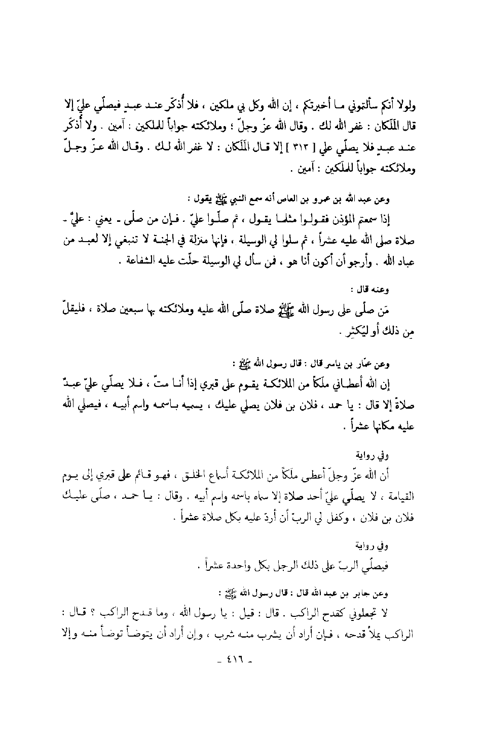 ولولا أنكم سألتموني ما أخبرتم، إن الله وكل بي ملكين، فلا أذكر عند عبد فيصلي علي إلا قال الملكان: غفر الله لك. وقال الله عز وجل؛ وملائكته جواباً للملكين: آمين. ولا أذكر عند عبد فلا يصلي علي إلا قال الملكان: لا غفر الله لك. وقال الله عز وجل وملائكته جواباً للملكين: آمين. وعن عبد الله بن عمرو بن العاص أنه سمع النبي يقول: إذا سمعتم المؤذن فقولوا مثلما يقول ثم صلوا علي. فإن من صلى - يعني: علي - صلاة من صلىالله عليه عشراً، ثم سلوا لي الوسيلة، فإنها منزلة في الجنة لا تنبغي إلا لعبد من عباد الله. وأرجو أن أكون أنا هو، فمن سأل لي الوسيلة حلت عليه الشفاعة. وعنه قال: من صلى على رسول الله صَلَّى اللهُ عَلَيْهِ وَسَلَّمَ صلاة صلى الله عليه وملائكته بها سبعين صلاة، فليقل من ذلك أو ليكثر. وعن عمار بن ياسر قال: قال رسول الله صَلَّى اللهُ عَلَيْهِ وَسَلَّمَ: إن الله أعطاني ملك من الملائكة يقوم على قبري إذا أنا مت، فلا يصلي علي عبد صلاة إلا قال: يا حمد، فلان بن فلان يصلي عليك، يسميه باسمه واسم أبيه، فيصلي الله عليه مكانها عشراً. وفي رواية أن الله عز وجل أعطى ملكاً من الملائكة أسماع الخلق، فهو قائم على قبري إلى يوم القيامة، لا يصلي علي أحد صلاة إلا سماه باسمه واسم أبيه. وقال: يا حمد، صلى عليك فلان بن فلان، وكفل لي الرب أن أرد عليه بكل صلاة عشراً. وفي رواية فيصلي الرب على ذلك الرجل بكل واحدة عشراً وعن جابر بن عبد الله قال: قال رسول الله صَلَّى اللهُ عَلَيْهِ وَسَلَّمَ: لا تجعلوني كقدح الراكب. قال: قيل: يا رسول الله صَلَّى اللهُ عَلَيْهِ وَسَلَّمَ، وما قدح الراكب؟ قال: الراكب يملأ قدحه، فإذا أراد أن يشرب منه شرب، وإن أراد أن يتوضأ توضأ منه وإلا