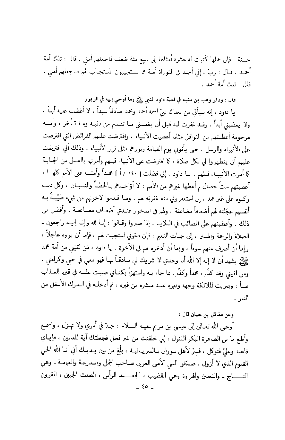 حسنة، فإن عملها كتبت له عشرة أمثالها إلى سبع مئة ضعف فاجعلهم أمتي. قال: تلك أمة أحمد. قال: رب، إني أجد في التوراة أمة هم المستجيبون المستجاب لهم فاجعلهم أمتي. قال: تلك أمة أحمد. قال: ذكر وهب بن منبه في قصة داود النبي صَلَّى اللهُ عَلَيْهِ وَسَلَّمَ وما أوحى إليه في الزبور: يا داود، إنه سيأتي من بعدك نبي اسمه أحمد ومحمد صادقاً سيداً، لا أغضب عليه أبداً، ولا يغضبني أبداً، وقد غفرت له قبل أن يغضبني ما تقدم من ذنبه وما تأخر، وأمته مرحومة أعطيتهم من النوافل مثلما أعطيت الأنبياء، وافترضت عليهم الفرائض التي افترضت على الأنبياء والرسل، حتى يأتون يوم القيامة ونورهم مثل نور الأنبياء، وذلك أني افترضت عليهم أن يتطهروا لكل صلاة، كما افترضت على الأنبياء قبلهم، وأمرتهم بالغسل من الجنابة كما أمرت الأنبياء قبلهم. يا داود، إني فضلت محمداً وأمته على الأمم كلها، أعطيتهم ست خصال لم أعطها غيرهم من الأمم: لا أؤاخذهم بالخطأ والنسيان، وكل ذنب ركبوه على غير عمد، إن استغفروني منه غفرته لهم، وما قدموا لآخرتهم من شيء طيبةً به أنفسهم عجلته لهم أضعافاً مضاعفة، ولهم في المدخور عندي أضعاف مضاعفة، وأفضل من ذلك. وأعطيتهم على المصائب في البلايا إذا صبروا وقالوا: إنا لله وإنا إليه راجعون الصلاة والرحمة والهدى، إلى جنات النعيم، فإن دعوني استجب لهم، فإما أن يروه عاجلاً، وإما أن أصرف عنهم سوءاً، وإما أن أدخر لهم في الآخرة. يا داود، من لقيني من أمة محمد صَلَّى اللهُ عَلَيْهِ وَسَلَّمَ يشهد أن لا إله إلا الله أنا وحدي لا شريك لي صادقاً بها فهو معي في حبي وكرامتي. ومن لقيني وقد كذب محمداً وكذب بما جاء به واستهزأ بكتابي صببت عليه في القبر العذاب صباً، وضربت الملائكة في وجهه ودبره عند منشره من قبره، ثم أدخله في الدرك الأسفل من النار. وعن مقاتل بن حيان قال: أوحى الله تعالى إلى عيسى بن مريم عليه السلام: جد في أمري ولا تهزل، واسمع وأطع يا بن الطاهرة البكر البتول، إني خلقتك من غير فحل فجعلتك آية للعالمينن فإياي فاعبد وعلي فتوكل، فسر لأخل سوران بالسريانية، بلغ من بين يديك أني أنا الله الحي القيوم الذي لا أزول. صدقوا النبي الأمي صاحب الجمل والمدرعة والعمامة وهي التاج والنعلين والهراوة وهي القضيب، الجعد الرأس، الصلت الجبين، المقرون