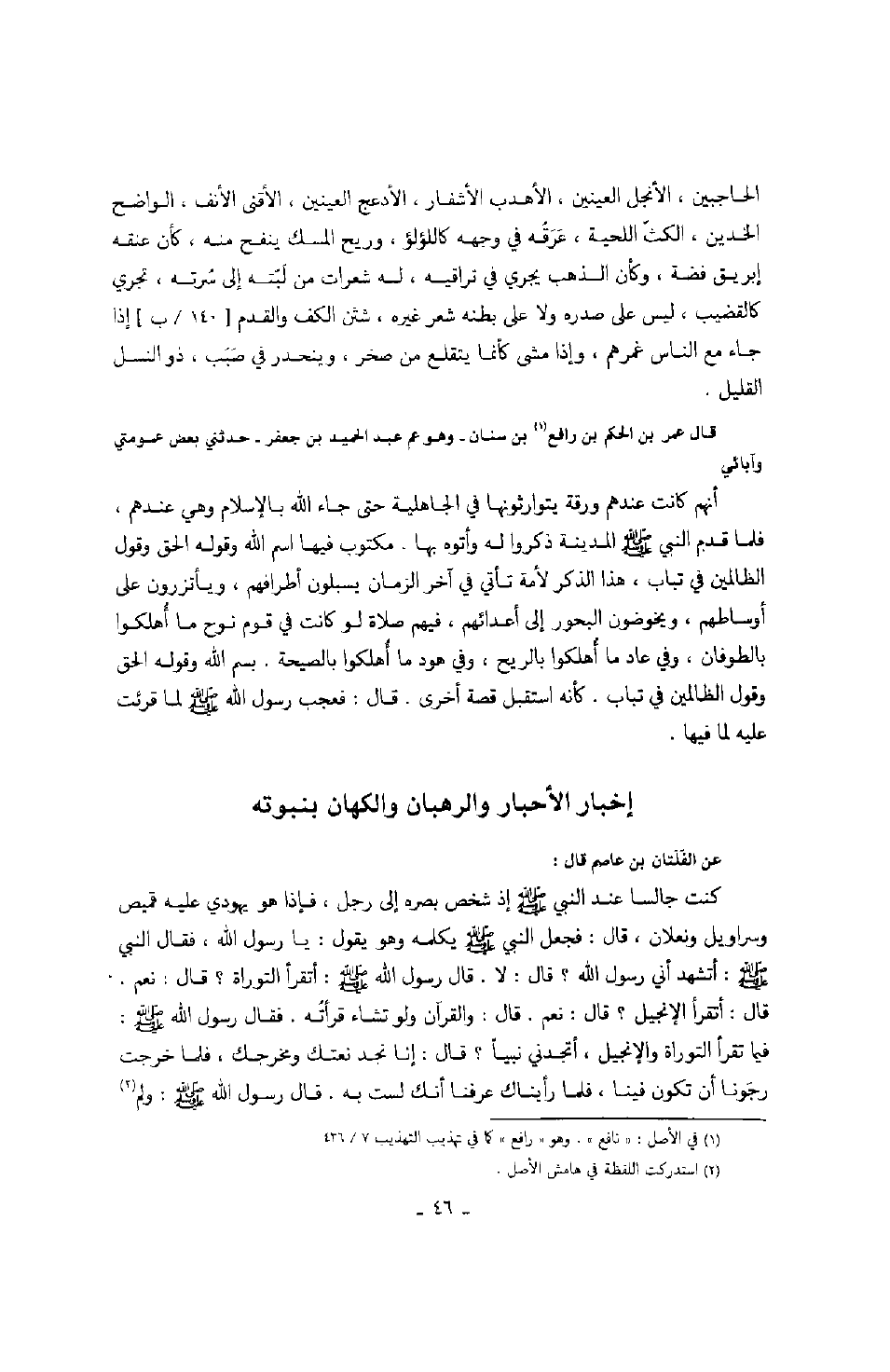 عن الفلتان بن عاصم قال: كنت جالساً عند النبي صَلَّى اللهُ عَلَيْهِ وَسَلَّمَ إذ شخص بصره إلى رجل، فإذا هو يهودي عليه قميص وسراويل ونعلان، قال: فجعل النبي صلى الله عليه وسلم يكلمه وهو يقول: يا رسول الله، فقال النبي صَلَّى اللهُ عَلَيْهِ وَسَلَّمَ: أتشهد أني رسول الله؟ قال: لا. قال رسول الله صَلَّى اللهُ عَلَيْهِ وَسَلَّمَ: أتقرأ التوراة؟ قال: نعم. قال: أتقرأ الإنجيل؟ قال: نعم. قال: والقرآن ولو تشاء قرأته. فقال رسول الله صَلَّى اللهُ عَلَيْهِ وَسَلَّمَ: فيما تقرأ التوراة والإنجيل، أتجدني نبياً؟ قال: إنا نجد نعتك ومخرجك، فلما خرجت رجونا أن تكون فينا، فلما رأيناك عرفنا أنك لست به. قال رسول الله صَلَّى اللهُ عَلَيْهِ وَسَلَّمَ: ولم
