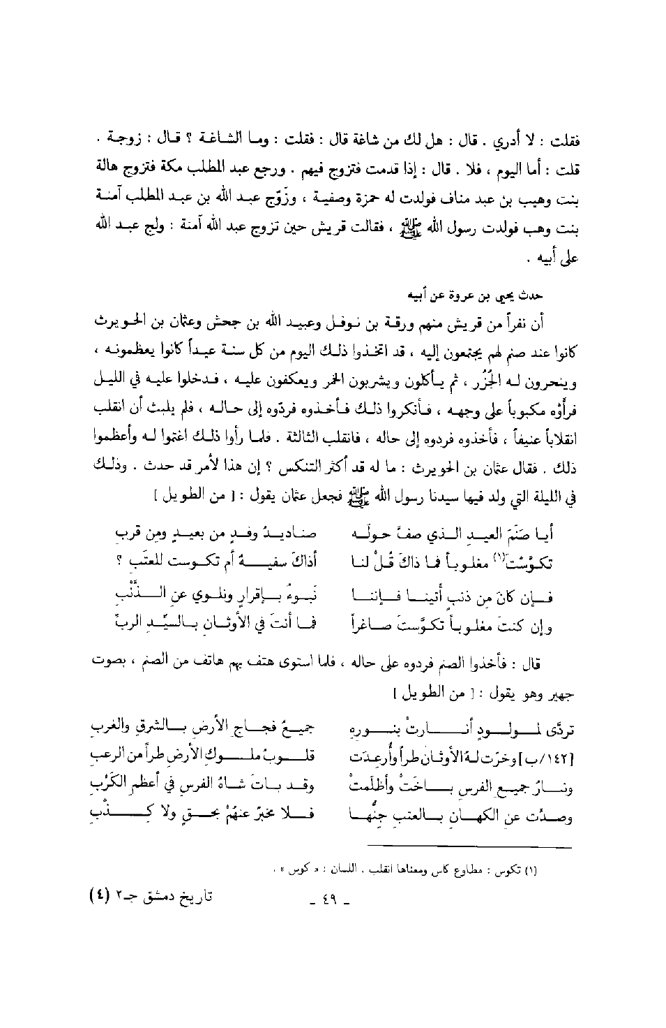 فقلت: لا أدري. قال: هل لك من شاغة قال: فقلت: وما الشاغة؟ قال: زوجة. قلت: أما اليوم، فلا. قال: إذا قدمت فتزوج فيهم. ورجع عبد المطلب مكة فتزوج هالة بنت وهيب بن عبد مناف فولدت له حمزة وصفية، وزوج عبد الله بن عبد المطلب آمنة بنت وهب فولدت رسول الله صَلَّى اللهُ عَلَيْهِ وَسَلَّمَ، فقالت قريش حين تزوج عبد الله آمنة: ولج عبد الله على أبيه. حدث يحيى بن عروة عن أبيه أن نفراً من قريش منهم ورقة بن نوفل وعبيد الله بن جحش وعثمان بن الحويرث كانوا عند صنم لهم يجتمعون إليه، قد اتخذوا ذلك اليوم من كل سنة عيداً كانوا يعظمونه، وينحرون له الجزر، ثم يأكلون ويشربون الخمر ويعكفون عليه، فدخلوا عليه في الليل فرأوه مكبوباً على وجهه، فأنكروا ذلك فأخذوه فردوه إلى حاله، فلم يلبث أن انقلب انقلاباً عنيفاً، فأخذوه فردوه إلى حاله، فانقلب الثالثة. فلما رأوا ذلك اغتموا له وأعظموا ذلك. فقال عثمان بن الحويرث: ما له قد أكثر التنكس؟ إن هذا لأمر قد حدث. وذلك في الليلة التي ولد فيها سيدنا رسول الله صَلَّى اللهُ عَلَيْهِ وَسَلَّمَ فجعل عثمان يقول: من الطويل.