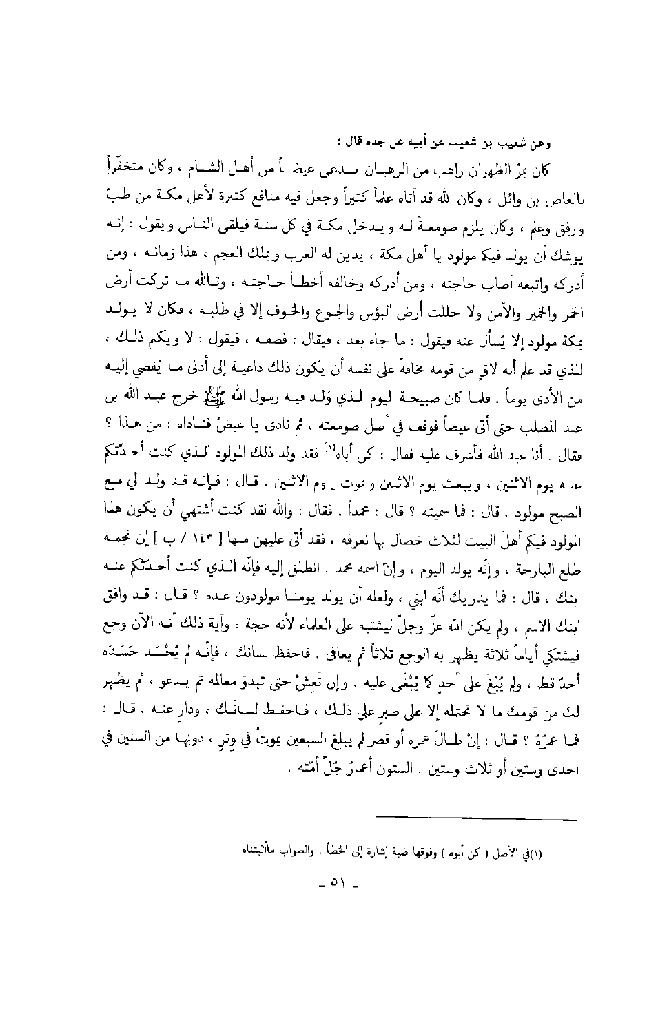 وعن شعيب بن شعيب عن أبيه عن جده قال: كان بمر الظهران راهب من الرهبان يدعى عيضاً من أهل الشام، وكان متخفراً بالعاص بن وائل، وكان الله قد أتاه علماً كثيراً وجعل فيه منافع كثيرة لأهل مكة من طب ورفق وعلم، وكان يلزم صومعة له ويدخل مكة في كل سنة فيلقى الناس ويقول: إنه يوشك أن يولد فيكم مولود يا أهل مكة، يدين له العرب ويملك العجم، هذا زمانه، ومن أدركه واتبعه أصاب حاجته، ومن أدركه وخالفه أخطأ حاجته. وتالله ما تركت أرض الخمر والخمير والأمن ولا حللت أرض البؤس والجوع والخوف إلا في طلبه، فكان لا يولد مولود بمكة إلا يسأل عنه فيقول: ما جاء بعد، فيقال: فصفه، فيقول: لا ويكتم ذلك، للذي قد علم أنه لاقٍ من قومه مخافةً على نفسه أن يكون ذلك داعية إلى أدنى ما يفضي إليه من الأذى يوماً. فلما كان صبيحة اليوم الذي ولد فيه رسول الله صَلَّى اللهُ عَلَيْهِ وَسَلَّمَ خرج عبد الله بن عبد المطلب حتى أتى عيضاً فوقف في أصل صومعته، ثم نادى يا عيض فناداه: من هذا؟ فقال: أنا عبد الله فأشرف عليه فقال: كن أباه فقد ولد ذلك المولود الذي كنت أحدثكم عنه يوم الاثنين، ويبعث يوم الاثنين ويموت يوم الاثنين. قال: فإنه قد ولد لي مع الصبح مولود. قال: فما سميته؟ قال: محمداً. فقال: والله لقد كنت أشتهي أن يكون هذا المولود فيكم أهل البيت لثلاث خصال بها نعرفه، فقد أتى عليهن منها إن نجمه طلع البارحة، وإنه يولد اليوم، وإن اسمه محمد. انطلق إليه فإنه الذي كنت أحدثكم عنه ابنك، قال: فما يدريك أنه ابني، ولعله يولد يومنا مولودون عدة؟ قال: قد وافق ابنك الاسم، ولم يكن الله عز وجل ليشتبه على العلماء لأنه حجة، وآية ذلك أنه الآن وجع فيشتكي أياماً ثلاثة يظهر به الوجع ثلاثاً ثم يعافى. فاحفظ لسانك، فإنه لم يحسد حسده أحدٌ قط، ولم يبغ على أحدٍ كما يبغى عليه. وإن تعش حتى تبدو معالمه ثم يدعو، ثم يظهر لك من قومك ما لا تحتمله إلا على صبرٍ على ذلك، فاحفظ لسانك، ودار عنه. قال: فما عمره؟ قال: إن طال عمره أو قصر لم يبلغ السبعين يموت في وترٍ، دونها من السنين في إحدى وستين أو ثلاث وستين. الستون أعمار جل أمته.