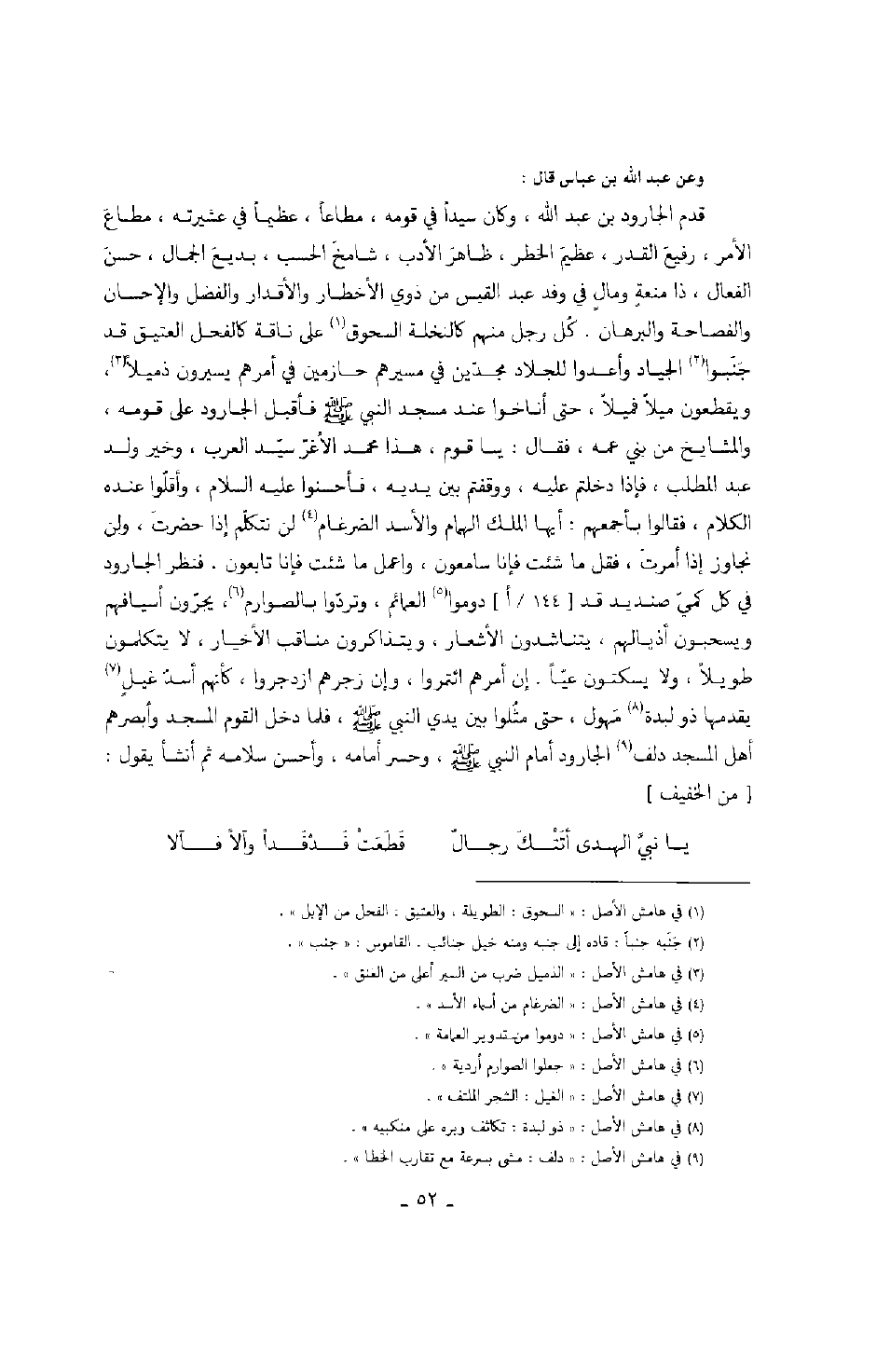 أمرت، فقل ما شئت فإنا سامعون، واعمل ما شئت فإنا تابعون. فنظر الجارود في كل كمي صنديد قد دوموا العمائم، وتردوا بالصوارم، يجرون أسيافهم ويسحبون أذيالهم، يتناشدون الأشعار، ويتذاكرون مناقب الأخيار، لا يتكلمون طويلاً، ولا يسكتون عياً. إن أمرهم ائتمروا، وإن زجرهم ازدجروا، كأنهم أسد غيل يقدمها ذو لبدة مهول، حتى مثلوا بين يدي النبي صَلَّى اللهُ عَلَيْهِ وَسَلَّمَ، فلما دخل القوم المسجد وأبصرهم أهل المسجد دلف الجارود أما النبي صَلَّى اللهُ عَلَيْهِ وَسَلَّمَ، وحسر أمامه، وأحسن سلامه ثم أنشأ يقول: من الخفيف فقل ما شئت فإنا سامعون، واعمل ما شئت فإنا تابعون. فنظر الجارود في كل كمي صنديد قد دوموا العمائم، وتردوا بالصوارم، يجرون أسيافهم ويسحبون أذيالهم، يتناشدون الأشعار، ويتذاكرون مناقب الأخيار، لا يتكلمون طويلاً، ولا يسكتون عياً. إن أمرهم ائتمروا، وإن زجرهم ازدجروا، كأنهم أسد غيل يقدمها ذو لبدة مهول، حتى مثلوا بين يدي النبي صَلَّى اللهُ عَلَيْهِ وَسَلَّمَ، فلما دخل القوم المسجد وأبصرهم أهل المسجد دلف الجارود أما النبي صَلَّى اللهُ عَلَيْهِ وَسَلَّمَ، وحسر أمامه، وأحسن سلامه ثم أنشأ يقول: من الخفيف