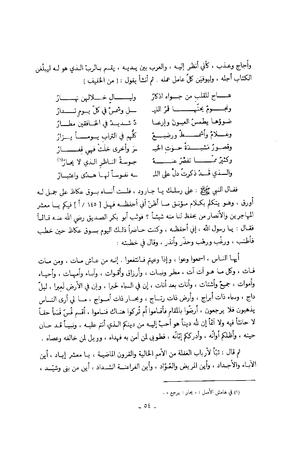 فقال النبي صَلَّى اللهُ عَلَيْهِ وَسَلَّمَ: على رسلك يا جارود، فلست أنساه بسوق عكاظ على جمل له أورق، وهو يتكلم بكلام مؤنق ما أظن أني احفظه فهل فيكم يا معشر المهاجرين والأنصار من يحفظ لنا منه شيئاً؟ فوثب أبو بكر الصديق رضي الله عنه قائماً فقال: يا رسول الله، إني أحفظه، وكنت حاضراً ذلك اليوم بسوق عكاظ حين خطب فأطنب، ورغب ورهب وحذر وأنذر، وقال في خطبته: أيها الناس، اسمعوا وعوا، وإذا وعيتم فانتفعوا، إنه من عاش مات، ومن مات فات، وكل ما هو آت أت، مطر ونبات، وأرزاق وأقوات، وآباء وأمهات، وأحياء وأموات، جميعٌ وأشتات، وأنات بعد أنات إن في السماء لخبرا، إن في الأرض لعبرا، ليلٌ داج، وسماء ذات أبراج، وأرض ذات رتاج، وبحار ذات أمواج، ما لي أرى الناس يذهبون فلا يرجعون، أرضوا بالمقام فأقاموا أم تركوا هناك فناموا، أقسم قس قسماً حقاً لا حانثاً فيه ولا أثماً إن لله ديناً هو أحب إليه من دينكم الذي أنتم عليه، ونبياً قد حان حينه، وأظلكم أوانه، وأدرككم إبانه، فطوبى لمن آمن به فهداه، وويل لمن خالفه وعصاه. ثم قال: تباً لأرباب الغفلة من الأمم الخالية والقرون الماضية، يا معشر إياد، أين الآباء والأجداد، وأين المريض والعواد، وأين الفراعنة الشداد، أين من بنى وشيد،