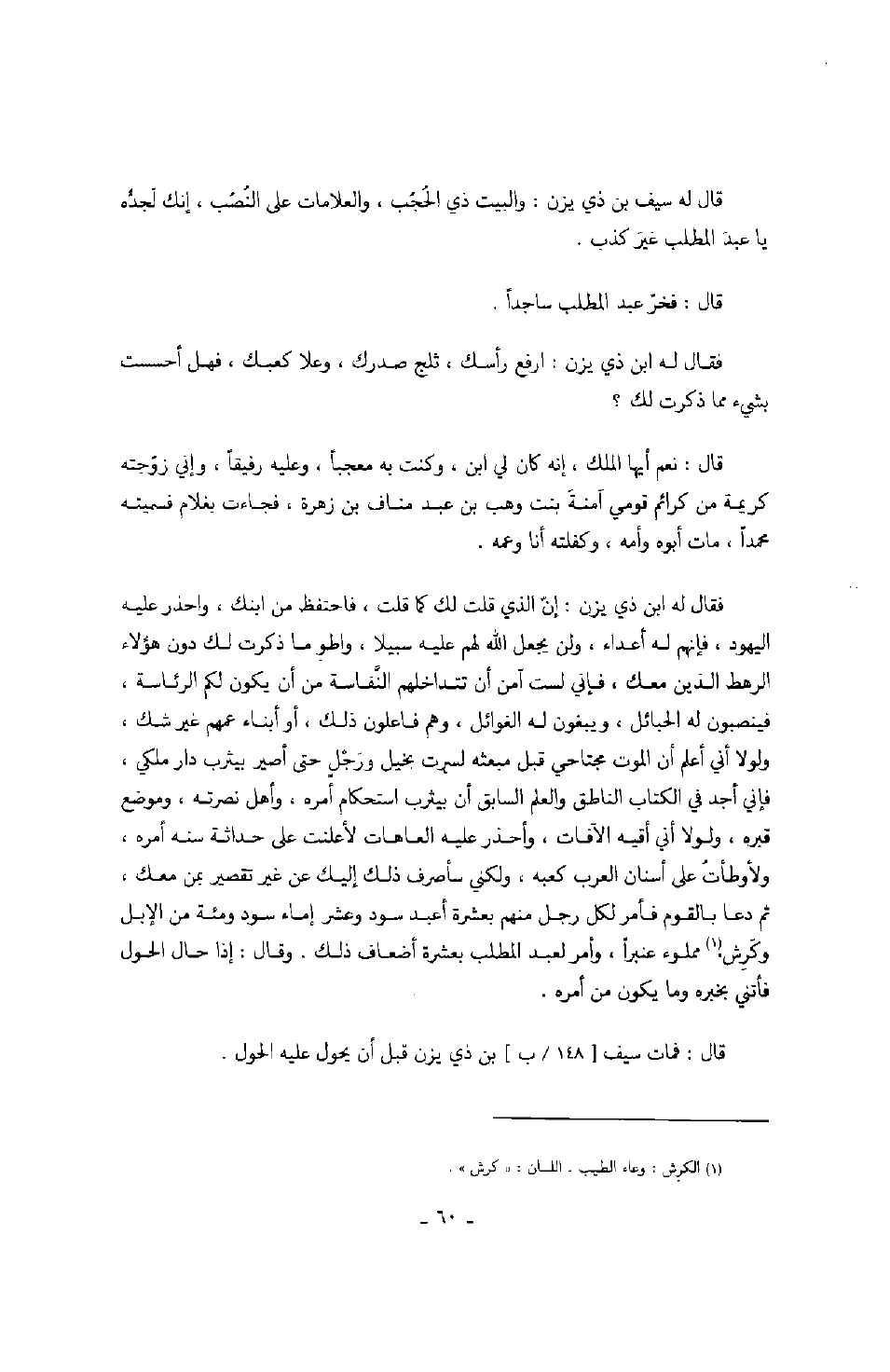 فقال له سيف ذي يزن: ارفع رأسك، ثلج صدرك، وعلا كعبك، فهل أحسست بشيء مما ذكرت لك؟ قال: نعم أيها الملك، إنه كان لي ابن، وكنت معجباً به، وعليه رفيقاً، وإني زوجته كريمة من كرائم قومي آمنة بنت وهب بن عبد مناف بن زهرة، فجاءت بغلام فسميته محمداً. مات أبوه وأمه، وكفلته أنا وعمه. فقال له ابن سيف ذي يزن: