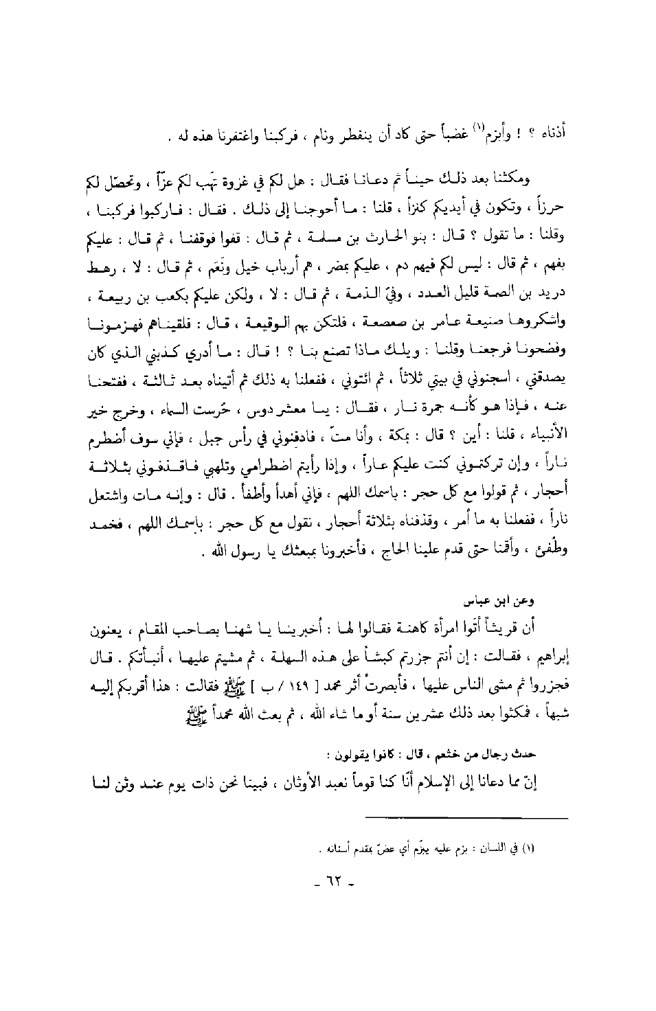 وأقمنا حتى قدم علينا الحاج، فأخبرونا بمبعثك يا رسول الله. وعن ابن عباس: أن قريشاً أتو امرأة كاهنة فقالوا لها: أخبرينا يا شهنا بصاحب المقام، يعنون إبراهيم، فقالت: إن أنتم جرزتم كبشاً على هذه السهلة، ثم مشيتم عليها، أنبأتكم. قال: فجرزوا ثم مشى الناس عليها، فأبصرت أثر محمد صَلَّى اللهُ عَلَيْهِ وَسَلَّمَ فقالت: هذا أقربكم إليه شبهاً، فمكثوا بعد ذلك عشرين سنة أو ما شاء الله تعالى، ثم بعث الله محمداً صَلَّى اللهُ عَلَيْهِ وَسَلَّمَ. حدث رجال من خثعم، قال: كانوا يقولون: إن مما دعانا إلى الإسلام أنا كنا قوماً نعبد الأوثان، فبينا نحن ذات يوم عند وثن لنا