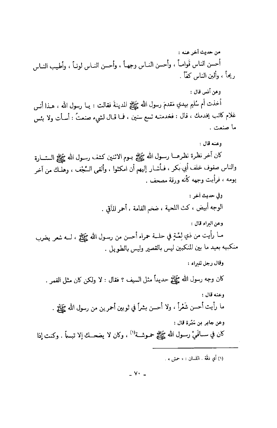 وعن البراء قال: ما رأيت من ذي لمةٍ في حلة حمراء أحسن من رسول الله صَلَّى اللهُ عَلَيْهِ وَسَلَّمَ، له شعر يضرب منكبيه بعيد ما بين المنكبين ليس بالقصير وليس بالطويل. وقال رجل للبراء: كان وجه رسول الله صَلَّى اللهُ عَلَيْهِ وَسَلَّمَ حديداً مثل السيف؟ فقال: لا ولكن كان مثل القمر. وعنه قال: ما رأيت أحسن شعراً، ولا أحسن بشراً في ثوبين أحمرين من رسول الله صَلَّى اللهُ عَلَيْهِ وَسَلَّمَ. وعن جابر بن سمرة قال: كان في ساقي رسول الله صَلَّى اللهُ عَلَيْهِ وَسَلَّمَ حموشة، وكان لا يضحك إلا تبسماً. وكنت إذا