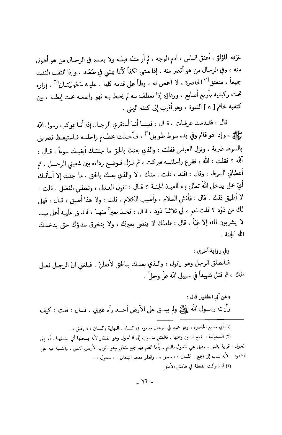 قال: فأفش السلام، وأطيب الكلام، قلت: ولا هذا أطيق، قال: فهل لك من ذود؟ قلت: نعم، لي ثلاثة ذود، قال: فخذ بعيراً منها، فاسق عليه أهل بيت لا يشربون الماء إلا غباً، قال: فلعلك لا ينضى بعيرك، ولا ينخرق سقاؤك حتى يدخلك الله الجنة. وفي رواية أخرى: فانطلق الرجل وهو يقول: والذي بعثك بالحق لأفعلن. فبلغني أن الرجل فعل ذلك، ثم قتل شهيداً في سبيل الله عز وجل. وعن أبي الطفيل قال: رأيت رسول الله صَلَّى اللهُ عَلَيْهِ وَسَلَّمَ ولم يبق على الأرض أحد رآه غيري. قال: قلت: كيف