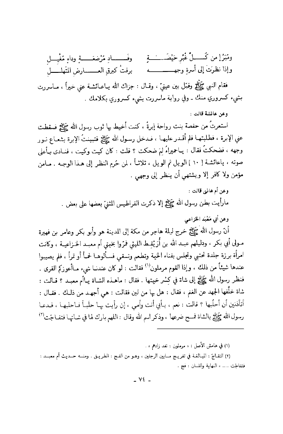 فقام النبي صَلَّى اللهُ عَلَيْهِ وَسَلَّمَ وقبل بين عيني، وقال: " جزاك الله يا عائشة عني خيراً، ما سررت بشيء كسروري منك وفي رواية ما سررت بشيء كسروري بكلامك. " وعن عائشة رضي الله عنها قالت: " استعرت من حفصة بنت رواحة إبرةً، كنت أخيط بها ثوب رسول الله صَلَّى اللهُ عَلَيْهِ وَسَلَّمَ فسقطت عني الإبرة، فطلبتها فلم أقدر عليها، فدخل رسول الله صَلَّى اللهُ عَلَيْهِ وَسَلَّمَ فتبينت الإبرة بشعاع نور وجهه، فضحكت فقال: يا حميراء لم ضحكت؟ قلت: كان كيت وكيت، فنادى بأعلى صوته، يا عائشة الويل ثم الويل، ثلاثاً، لمن حرم النظر إلى هذا الوجه. ما من مؤمن ولا كافر إلا ويشتهي أن ينظر إلى وجهي. وعن أم هانئ رضي الله عنها قالت: ما رأيت بطن رسول الله صلى الله صَلَّى اللهُ عَلَيْهِ وَسَلَّمَ إلا ذكرت القراطيس المثني بعضها على بعض. وعن أبي معبد الخزاعي: أن رسول الله صَلَّى اللهُ عَلَيْهِ وَسَلَّمَ خرج ليلة هاجر من مكة إلى المدينة هو وأبو بكر رضي الله عنه وعامر بن فهيرة مولى أبي بكر، ودليلهم عبد الله بن أريقط الليثي فمروا بخيمتي أم معبد الخراعية، وكانت امرأة برزة جلدة تحتبي وتجلس بفناء الخيمة وتطعم وتسقي فسألوها لحماً أو تمراً، فلم يصيبوا عندها شيئاً من ذلك، وإذا القوم مرملون فقالت: لو كان عندنا شيء ما أعوزكم القرى. فنظر رسول الله صَلَّى اللهُ عَلَيْهِ وَسَلَّمَ إلى شاة في كسر خيمتها. فقال: " ما هذه الشاة يا أم معبد؟ " قالت: شاة خلفها الجهد عن الغنم، فقال: " هل بها من لبن " فقالت: هي أجهد من ذلك. فقال: " أتأذنين أن أحلبها؟ " قالت: نعم، بأبي أنت وأمي، إن رأيت بها حلباً فاحلبها، فدعا رسول الله صَلَّى اللهُ عَلَيْهِ وَسَلَّمَ بالشاة فمسح ضرعها، وذكر اسم الله وقال: " اللهم بارك لها في شاتها " فتفاجت