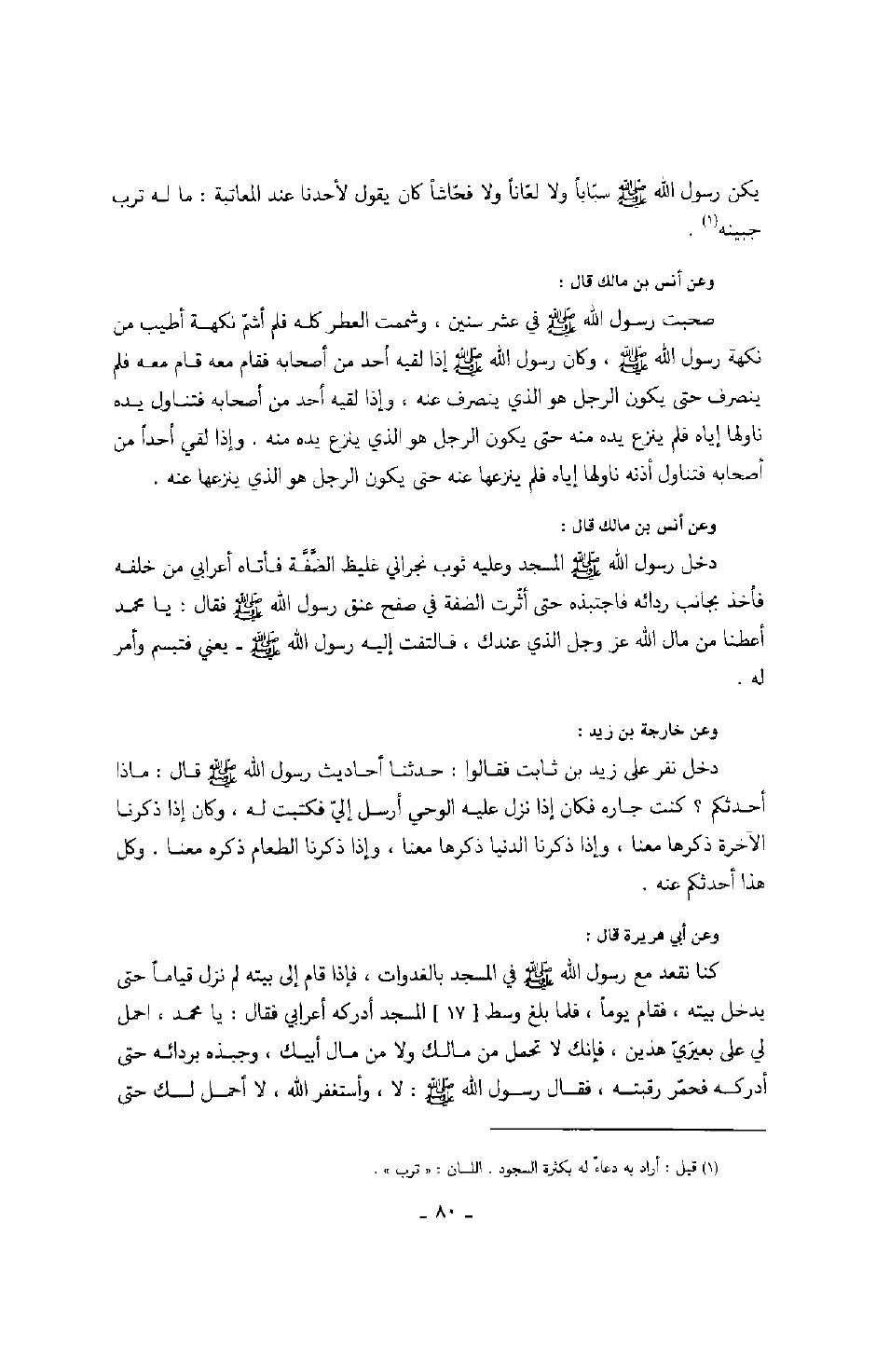 وعن أنس بن مالك رضي الله عنه قال: دخل رسول الله صَلَّى اللهُ عَلَيْهِ وَسَلَّمَ المسجد وعليه ثوب نجراني غليظ الضفة فأتاه أعرابي من خلفه فأخذ بجانب ردائه حتى أثرت الضفة في صفح عنق رسول الله صَلَّى اللهُ عَلَيْهِ وَسَلَّمَ فقال: يا محمد أعطنا من مال الله عز وجل الذي عندك، فالتفت رسول الله صَلَّى اللهُ عَلَيْهِ وَسَلَّمَ يعني فتبسم وأمر له. وعن خارجة بن زيد: دخل نفر على زيد بن ثابت رضي الله عنه فقالوا: حدثنا أحاديث رسول الله صَلَّى اللهُ عَلَيْهِ وَسَلَّمَ قال: ماذا أحدثكم؟ كنت جاره فكان إذا نزل عليه الوحي أرسل إلي فكتبت له، وكان إذا ذكرنا الآخرة ذكرها معنا، وإذا ذكرنا الدنيا ذكرها معنا، وإذا ذكرنا الدنيا ذكرها معنا، وإذا ذكرنا الطعام ذكره معنا. وكل هذا أحدثكم عنه. وعن أبي هريرة رضي الله عنه قال: كنا نقعد مع رسول الله صَلَّى اللهُ عَلَيْهِ وَسَلَّمَ في المسجد بالغدوات، فإذا قام إلى بيته لم نزل قياماً حتى يدخل بيته، فقام يوماً، فلما بلغ وسط المسجد أدركه أعرابي فقال: يا محمد، احمل لي بعيري هذين، فإنك لا تحمل من مالك ولا من مال أبيك، وجبذه بردائه حتى أدركه فحمر رقبته، فقال رسول الله صَلَّى اللهُ عَلَيْهِ وَسَلَّمَ: " لا، وأستغفر الله، لا أحمل لك حتى