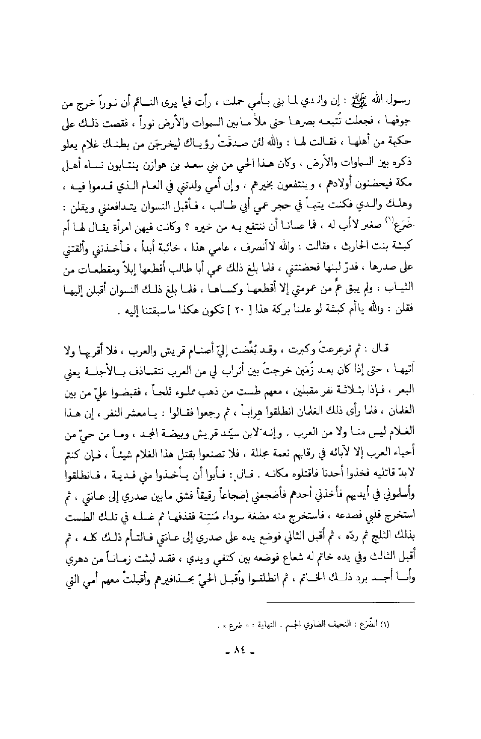 رسول الله صَلَّى اللهُ عَلَيْهِ وَسَلَّمَ: " إن والدي لما بنى بأمي حملت، رأت فيما يرى النائم أن نوراً خرج من جوفها، فجعلت تتبعه بصرها حتى ملأ ما بين السماوات والأرض نوراً، فقصت ذلك على حكيمة من أهلها، فقالت لها: والله لئن صدقت رؤياك ليخرجن من بطنك غلام يعلو ذكره بين السموات والأرض، وكان هذا الحي من بني سعد بن هوزان ينتابون نساء أهل مكة فيحضنون أولادهم، وينتفعون بخيرهم، وإن أمي ولدتني في العام الذي قدموا فيه، وهلك والدي فكنت يتيماً في حجر عمي أبي طالب، فأقبل النسوان يتدافعنني ويقلن: ضرع صغير لا أب له، فما عسانا أن ننتفع به من خير؟ وكانت فيهن امرأة يقال لها أم كبشة بنت الحارث، فقالت: والله لا أنصرف، عامي هذا، خائبة أبداً، فأخذتني وألقتني على صدرها، فدر لبنها فحضنتني، فلما بلغ ذلك عكي أبا طالب أقطعها إبلاً ومقطعات من الثياب ولم يبق عم من عمومتي إلا أقطعها وكساها، فلما بلغ ذلك النسوان أقبلن إليها فقلن: والله يا أم كبشة لو علمنا بركة هذا الغلام تكون هكذا ما سبقتنا إليه. قال: ثم ترعرعت وكبرت، وقد بغضت إلى أصنام قريش والعرب، فلا أقربها ولا آتيها، حتى إذا كان بعد زمين خرجت بين أتراب لي من العرب نتقاذف بالأجلة يعني البعر، فإذا بثلاثة نفر مقبلين، معهم طست من ذهب مملوء ثلجاً، فقبضوا علي من بين الغلمان، فلما رأى ذلك الغلمان انطلقوا هراباً، ثم رجعوا فقالوا: يا معشر النفر، إن هذا الغلام ليس منا ولا من العرب. وإنه لابن سيد قريش وبيضة المجد، وما من حي من أحياء العرب إلا لآبائه في رقابهم نعمة مجللة، فلا تصنعوا بقتل هذا الغلام شيئاً، فإن كنتم لا بد قاتليه فخذوا أحدنا فاقتلوه مكانه. قال: فأبوا أن يأخذوا مني فدية، فانطلقوا وأسلموني في أيديهم فأخذني أحدهم فأضجعني إضجاعاً رقيقاً فشق ما بين صدري إلى عانتي، ثم استخرج قلبي فصدعه، فاستخرج منه مضغة سوداء منتنة فقذفها ثم غسله في تلك الطست بذلك الثلج ثم رده، ثم أقبل الثاني فوضع يده على صدري إلى عانتي فالتأم ذلك كله، ثم أقبل الثالث وفي يده خاتم له شعاع فوضعه بين كتفي ويدي، فقد لبثت زماناً من دهري وأنا أجد برد ذلك الخاتم، ثم انطلقوا وأقبل الحي بحذافيرهم وأقبلت معهم أمي التي