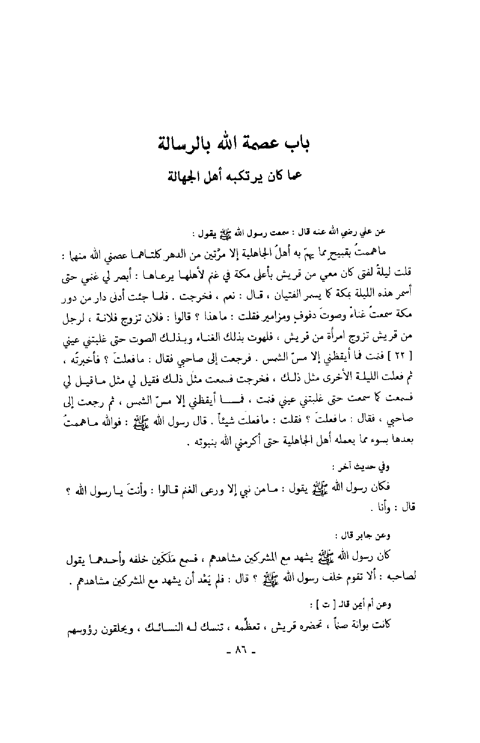 عن علي رضي الله عنه قال: سمعت رسول الله صَلَّى اللهُ عَلَيْهِ وَسَلَّمَ يقول: " ماهممت بقبيحٍ مما يهم أهل الجاهلية إلا مرتين من الدهر كلتاهما عصمني الله منهما: قلت ليلةً لفتى كان معي من قريش بأعلى مكة في غنم لأهلها يرعاها: أبصر لي غنمي حتى أسمر هذه الليلة بمكة كما يسمر الفتيان، قال: نعم، فخرجت. فلما جئت أدنى دار من دور مكة سمعت غناءً وصوت دفوفٍ ومزامير فقلت: ما هذا؟ قالوا: فلان تزوج فلانة، لرجل من قريش تزوج امرأة من قريش، فلهوت بدلك الغناء وبذلك الصوت حتى غلبتني عيني فنمت فما أيقظني إلا مس الشمس. فرجعت إلى صاحبي فقال: ما فعلت؟ فأخبرته، ثم فعلت الليلة الأخرى مثل ذلك، فخرجت فسمعت مثل ذلك فقيل لي مثل ما قيل لي فسمعت كما سمعت حتى غلبتني عيني فنمت، فما أيقظني إلا مس الشمس، ثم رجعت إلى صاحبي، فقال: ما فعلت؟ فقلت: ما فعلت شيئاً. قال رسول الله صَلَّى اللهُ عَلَيْهِ وَسَلَّمَ: فو الله ما هممت بعدها بسوء مما يعمله أهل الجاهلية حتى أكرمني الله بنبوته ". وفي حديث آخر: فكان رسول الله صَلَّى اللهُ عَلَيْهِ وَسَلَّمَ يقول: " ما من نبي إلا ورعى الغنم قالوا: وأنت يا رسول الله؟ قال: وأنا ". وعن جابر قال: كان رسول الله صَلَّى اللهُ عَلَيْهِ وَسَلَّمَ يشهد مع المشركين مشاهدهم، فسمع ملكين خلفه وأحدهما يقول لصاحبه: ألا تقوم خلف رسول الله صَلَّى اللهُ عَلَيْهِ وَسَلَّمَ؟ قال: فلم يعد أن يشهد مع المشركين مشاهدهم.