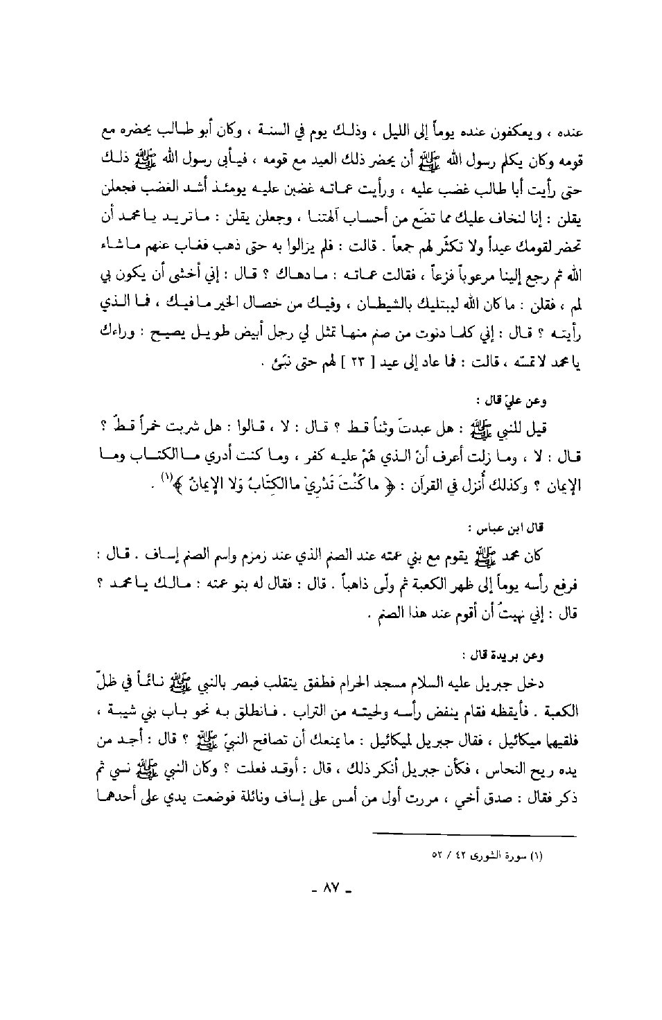 عنده، ويعكفون عنده يوماً إلى الليل، وذلك يوم في السنة، وكان أبو طالب يحضره مع قومه وكان يكلم رسول الله صَلَّى اللهُ عَلَيْهِ وَسَلَّمَ أن يحضر ذلك العيد مع قومه، فيأبى رسول الله صَلَّى اللهُ عَلَيْهِ وَسَلَّمَ ذلك حتى رأيت أبا طالب غضب عليه، ورأيت عماته غضبن عليه يومئذ أشد الغضب فجعلن يقلن: إنا لنخاف عليك مما تضع من أحساب آلهتنا، وجعلن يقلن: ما تريد يا محمد أن تحضر لقومك عيداً ولا تكثر لهم جمعاً. قالت: فلم يزالوا به حتى ذهب فغاب عنهم ما شاء الله ثم رجع إلينا مرعوباً فزعاً، فقالت عماته: ما دهاك؟ قال: إني أخشى أم يكون بي لمم، فقلن: ما كان الله ليبتليك بالشيطان، وفيك من خصال الخير ما فيك، فما الذي رأيته؟ قال: إني كلما دنوت من صنم منها تمثل لي رجل أبيض طويل يصيح: وراءك يا محمد لا تمسه، قالت: فما عاد إلى عيد لهم حتى نبئ. وعن علي رضي الله عنه قال: قيل للنبي صَلَّى اللهُ عَلَيْهِ وَسَلَّمَ: هل عبدت وثناً قط؟ قال: لا، قالوا: هل شربت خمراً قط؟ قال: لا، وما زلت أعرف أن الذي هم عليه كفر، وما كنت أدري ما الكتاب وما الإيمان؟ وكذلك أنزل في القرآن: " ما كنت تدري ما الكتاب ولا الإيمان ". قال ابن عباس: كان محمد صَلَّى اللهُ عَلَيْهِ وَسَلَّمَ يقوم مع بني عمته عند الصنم الذي عند زمزم واسم الصنم إساف. قال: فرفع رأسه يوماً إلى ظهر الكعبة ثم ولى ذاهباً. قال: فقال له بنو عمته: ما لك يا محمد؟ قال: إني نهيت أن أقوم عند هذا الصنم. وعن بريدة قال: دخل جبريل عليه السلام مسجد الحرام فطفق يتقلب فبصر بالنبي صَلَّى اللهُ عَلَيْهِ وَسَلَّمَ نائماً في ظل الكعبة. فأيقظه فقام ينفض رأسه ولحيته من التراب. فانطلق به نحو باب بني شيبة، فلقيهما ميكائيل، فقال جبريل لميكائيل: ما يمنعك أن تصافح النبي صَلَّى اللهُ عَلَيْهِ وَسَلَّمَ؟ قال: أجد من يده ريح النحاس، فكأن جبريل أنكر ذلك، قال: أوقد فعلت؟ وكان النبي صَلَّى اللهُ عَلَيْهِ وَسَلَّمَ نسي ثم ذكر فقال: صدق أخي، مررت أول أمس على إساف ونائلة فوضعت يدي على أحدهما