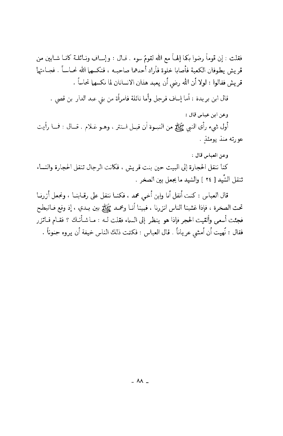 فقلت: إن قومي رضوا بكما إلهاً مع الله لقوم سوء. قال: وإساف ونائلة كانا شابين من قريش يطوفان بالكعبة فأصابا خلوة فأراد أحدهما صاحبه، فنكسهما الله نحاساً، فجاءتهما قريش فقالوا: لولا أن الله رضي أن يعبد هذان الإنسانان لما نكسهما نحاساً. قال ابن بريدة: أما إساف فرجل من وأما نائلة فامرأة من بني عبد الدار بن قصي. وعن ابن عباس قال: أول شيء رأى النبي صَلَّى اللهُ عَلَيْهِ وَسَلَّمَ من النبوة أن قيل استتر، وهو غلام. قال: فما رأيت عورته منذ يومئذٍ. وعن العباس قال: كنا ننقل الحجارة إلى البيت حين بنت قريش، فكانت الرجال تنقل الحجارة والنساء تنقل الشيد؛ والشيد ما يجعل بين الصخر. قال العباس: كنت أنقل أنا وابن أخي محمد صَلَّى اللهُ عَلَيْهِ وَسَلَّمَ، فكنا ننقل على رقابنا، ونجعل أزرنا تحت الصخرة، فإذا غشينا الناس اتزرنا فبينا أنا ومحمد صَلَّى اللهُ عَلَيْهِ وَسَلَّمَ بين يدي، إذ وقع فانبطح فجئت أسعى وألقيت الحجر فإذا هو ينظر إلى السماء فقلت له: ما شأنك؟ فقام فاتزر فقال: نهيت أن أمشي عرياناً، قال العباس: فكتمت ذلك عن الناس خيفة أن يروه جنوناً.