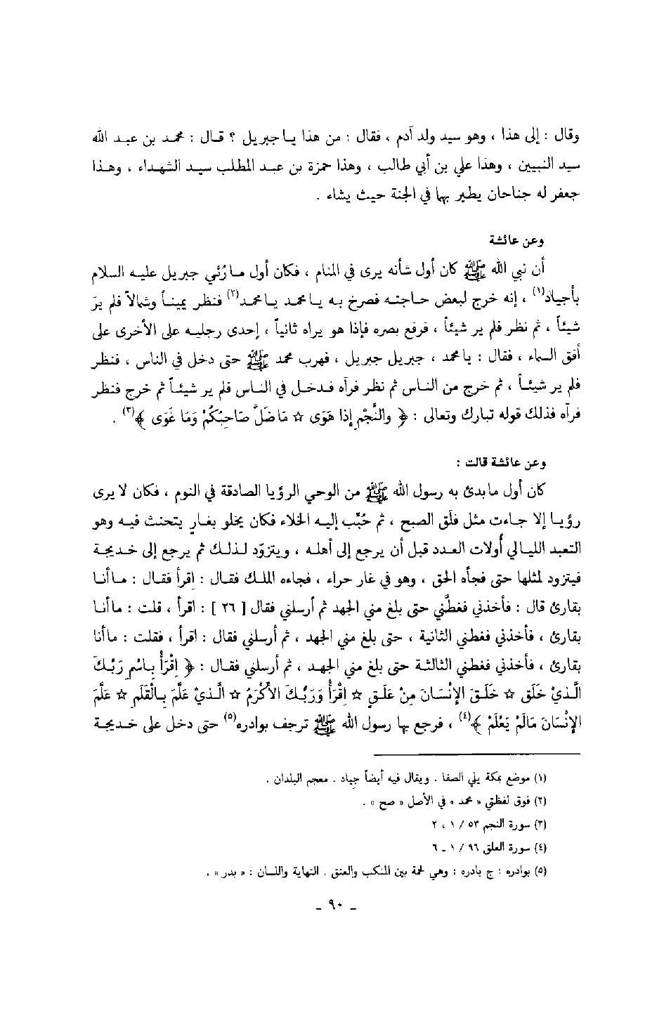 وعن عائشة رضي الله عنها قال: أن نبي الله صَلَّى اللهُ عَلَيْهِ وَسَلَّمَ كان أول شأنه يرى في المنام، فكان أول ما رئي جبريل عليه السلام بأجياد، وإنه خرج لبعض حاجته فصرخ به يا محمد يا محمد فنظر يميناً وشمالاً فلم ير شيئاً، ثم نظر فلم ير شيئاً، فرفع بصره فإذا هو يراه ثانياً، إحدى رجليه على الأخرى على أفق السماء، فقال: يا محمد، جبريل جبريل، فهرب محمد صَلَّى اللهُ عَلَيْهِ وَسَلَّمَ حتى دخل في الناس، فنظر فلم ير شيئاً، ثم خرج من الناس ثم نظر فرآه فدخل في الناس فلم ير شيئاً ثم خرج فنظر فرآه فذلك قوله تبارك وتعالى: " والنجم إذا هوى ما ضل صاحبكم وما غوى ". وعن عائشة رضي الله عناه قالت: كان أول ما بدئ به رسول الله صَلَّى اللهُ عَلَيْهِ وَسَلَّمَ من الوحي الرؤيا الصادقة في النوم، فكان لا يرى رؤيا إلا جاءت مثل فلق الصبح، ثم حبب إليه الخلاء فكان يخلو بغارٍ يتحنث فيه وهو التعبد الليالي أولات العدد قبل أن يرجع إلى أهله، ويتزود لذلك ثم يرجع إلى خديجة فيتزود لمثلها حتى فجأه الحق، وهو في غار حراء، فجاءه الملك فقال: اقرأ فقال: ما أنا بقارئ قال: فأخذني فغطني حتى بلغ مني الجهد ثم أرسلني فقال: اقرأ، قلت: ما أنا بقارئ، فأخذني فغطني الثانية، حتى بلغ مني الجهد، ثم أرسلني فقال: اقرأ، فقلت: ما أنا بقارئ، فأخذني فغطني الثالثة حتى بلغ مني الجهد، ثم أرسلني فقال: " اقرأ باسم ربك الذي خلق خلق الإنسان من علق اقرأ وربك الأكرم الذي علم بالقلم علم الإنسان ما لم يعلم "، فرجع بها رسول الله صَلَّى اللهُ عَلَيْهِ وَسَلَّمَ ترجف بوادره حتى دخل على خديجة