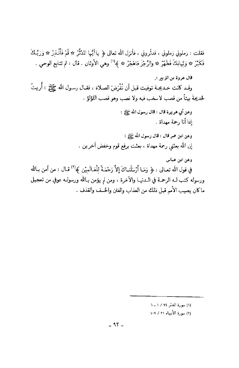 فقلت: زملوني زملوني، فدثروني، فانزل الله تعالى: " يا أيها المدثر قم فأنذر وربك فكبر وثيابك فطهر والرجز فاهجر " وهي الأوثان. قال: ثم تتابع الوحي. قال عروة بن الزبير: وقد كانت خديجة توفيت قبل أن تفرض الصلاة، فقال رسول الله صَلَّى اللهُ عَلَيْهِ وَسَلَّمَ: " أريت لخديجة بيتاً من قصب لا سخب فيه ولا نصب وهو قصب اللؤلؤ ". وعن أبي هريرة رضي الله عنه قال: قال رسول الله صَلَّى اللهُ عَلَيْهِ وَسَلَّمَ: " إنما أنا رحمة مهداة ". وعن ابن عمر رضي الله عنه قال: قال رسول الله صَلَّى اللهُ عَلَيْهِ وَسَلَّمَ: " إن الله بعثني رحمة مهداة، بعثت برفع قوم وخفض آخرين ". وعن ابن عباس في قول الله تعالى: " وما أرسلناك إلا رحمةً للعالمين " قال: من آمن بالله ورسوله كتب له الرحمة في الدنيا والآخرة، ومن لم يؤمن بالله ورسوله عوفي من تعجيل ما كان يصيب الأمم قبل ذلك من العذاب والفتن والخسف والقذف.