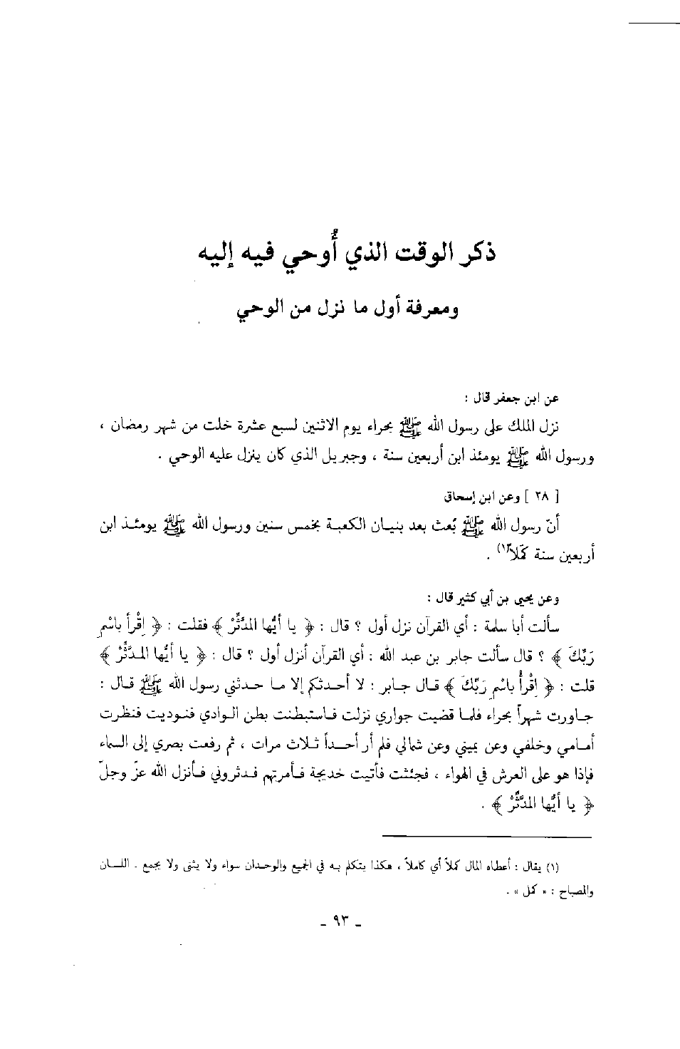 عن ابن جعفر قال: نزل الملك على رسول الله صَلَّى اللهُ عَلَيْهِ وَسَلَّمَ بحراء يوم الاثنين لسبع عشرة خلت من شهر رمضان، ورسول الله صَلَّى اللهُ عَلَيْهِ وَسَلَّمَ يومئذٍ ابن أربعين سنة، وجبريل الذي كان ينزل عليه الوحي. وعن ابن إسحاق أن رسول الله صَلَّى اللهُ عَلَيْهِ وَسَلَّمَ بعث بعد بنيان الكعبة بخمس سنين ورسول الله صَلَّى اللهُ عَلَيْهِ وَسَلَّمَ يومئذٍ ابن أربعين سنة كملاً. وعن يحيى بن أبي كثير قال: سألت أبا سلمة: أي القرآن نزل أول؟ قال: " يا أيها المدثر " فقلت: " اقرأ باسم ربك "؟ قال سألت جابر بن عبد الله: أي القرآن أنزل أول؟ قال: " يا أيها المدثر " قلت: " اقرأ باسم ربك " قال جابر: لا أحدثكم إلا ما حدثني رسول الله صَلَّى اللهُ عَلَيْهِ وَسَلَّمَ قال: " جاورت شهراً بحراء فلما قضيت جواري نزلت فاستبطنت بطن الوادي فنوديت فنظرت أمامي وخلفي وعن يميني وعن شمالي فلم أر أحداً ثلاث مرات، ثم رفعت بصري إلى السماء فإذا هو على العرش في الهواء، فجئثت فأتيت خديجة فأمرتهم فدثروني فأنزل الله عز وجل " يا أيها المدثر "