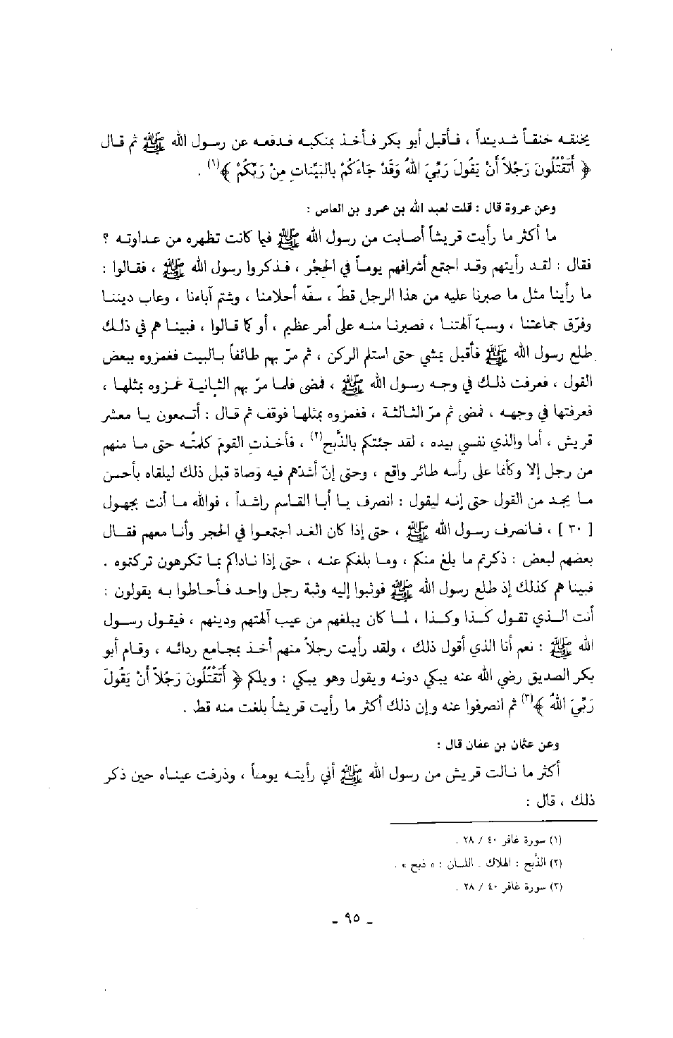 يخنقه خنقاً شديداً، فأقبل أبو بكر رضي الله عنه فأخذ بمنكبه فدفعه عن رسول الله صَلَّى اللهُ عَلَيْهِ وَسَلَّمَ ثم قال: " أتقتلون رجلاً أن يقول ربي الله وقد جاءكم بالبينات من ربكم ". وعن عروة قال: قلت لعبد الله بن عمرو بن العاص رضي الله عنهما: ما اكثر ما رأيت قريشاً أصابت رسول الله صَلَّى اللهُ عَلَيْهِ وَسَلَّمَ فيما كانت تظهره من عداوته؟ فقال: لقد رأيتهم وقد اجتمع أشرافهم يوماً في الحجر، فذكروا رسول الله صَلَّى اللهُ عَلَيْهِ وَسَلَّمَ، فقالوا: ما رأينا مثل ما صبرنا عليه من هذا الرجل قط، سفه أحلامنا، وشتم آباءنا، وعاب ديننا وفرق جماعتنا، وسب آلهتنا، فصبرنا منه على أمر عظيم، أو كما قالوا، فبينا هم في ذلك طلع رسول الله صَلَّى اللهُ عَلَيْهِ وَسَلَّمَ فأقبل يمشي حتى استلم الركن، ثم مر بهم طائفاً بالبيت فغمزوه ببعض القول، فعرفت ذلك في وجه رسول الله صَلَّى اللهُ عَلَيْهِ وَسَلَّمَ، فمضى فلما مر بهم الثانية غمزوه بمثلها، فعرفتها في وجهه، فمضى ثم مر الثالثة، فغمزوه بمثلها فوقف ثم قال: أتسمعون يا معشر قريش، أما والذي نفسي بيده، لقد جئتكم بالذبح، فأخذت القوم كلمته حتى ما منهم من رجل إلا وكأنما على رأسه طائر واقع، وحتى إن أشدهم فيه وصاة قبل ذلك ليلقاه بأحسن ما يجد من القول حتى أنه ليقول: انصرف يا أبا القاسم راشداً، فو الله ما أنت بجهول، فانصرف رسول الله صَلَّى اللهُ عَلَيْهِ وَسَلَّمَ، حتى إذا كان الغد اجتمعوا في الحجر وأنا معهم فقال بعضهم لبعض: ذكرتم ما بلغ منكم، وما بلغكم عنه، حتى إذا ناداكم بما تكرهون تركتموه. فبينا هم كذلك إذ طلع رسول الله صَلَّى اللهُ عَلَيْهِ وَسَلَّمَ فوثبوا إليه وثبة رجل واحد فأطاحوا به يقولون: أنت الذي تقول كذا وكذا، لما كان يبلغهم من عيب آلهتهم ودينهم، فيقول رسول الله صَلَّى اللهُ عَلَيْهِ وَسَلَّمَ: نعم أنا الذي أقول ذلك، ولقد رأيت رجلاً منهم أخذ بمجامع ردائه، وقام أبو بكر الصديق رضي الله عنه يبكي دونه ويقول وهو يبكي: ويلكم " أتقتلون رجلاً أن يقول ربي الله ". ثم انصرفوا عنه وإن ذلك أكثر ما رأيت قريشاً بلغت منه قط. وعن عثمان بن عفان رضي الله عنه قال: أكثر ما نالت قريش من رسول الله صَلَّى اللهُ عَلَيْهِ وَسَلَّمَ أني رأيته يوماً، وذرفت عيناه حين ذكر ذلك، قال: