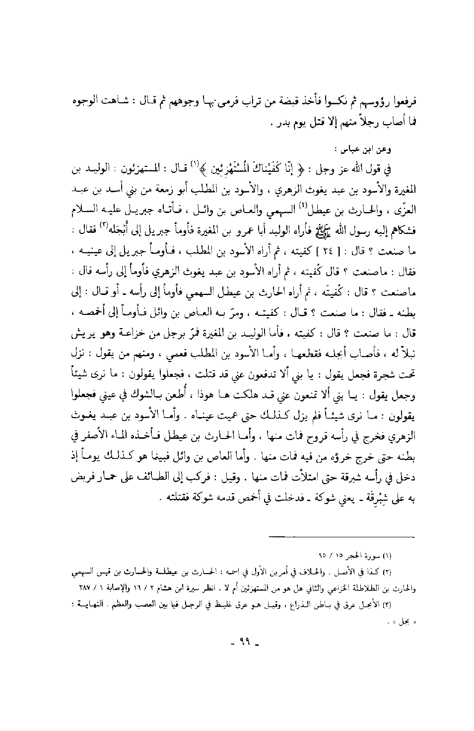 فرفعوا رؤوسهم ثم نكسوا فأخذ من تراب فرمى بها وجوههم ثم قال: شاهت الوجوه فما أصاب رجلاً منهم إلا قتل يوم بدر. وعن ابن عباس: في قول الله عز وجل: " إنا كفيناك المستهزئين " قال: المستهزئون: الوليد بن المغيرة والأسود بن عبد يغوث الزهري، والأسود بن المطلب أبو زمعة من بني أسد بن عبد العزى، والحارث بن عطيل السهمي والعاص بن وائل، فأتاه جبريل عليه السلام فشكاهم إليه رسول الله صَلَّى اللهُ عَلَيْهِ وَسَلَّمَ فأراه الوليد أبا عمرو بن المغيرة فأومأ جبريل إلى أبجلة فقال: ما صنعت؟ قال: كفيته، ثم أراه الأسود بن عبد يغوث الزهري فأومأ إلى رأسه قال: ما صنعت؟ قال: كفيته، ثم أراه الحارث بن عطيل السهمي فأومأ إلى رأسه أو قال: إلى بطنه فقال: ما صنعت؟ قال: كفيته، ومر به العاص بن وائل فأومأ إلى أخمصه، قال: ما صنعت؟ قال: كفيته، فأما الوليد بن المغيرة فمر برجل من خزاعة وهو يريش نبلاً له، فأصاب أبجله فقطعها، وأما الأسود بن المطلب فعمي، ومنهم من يقول: نزل تحت شجرة فجعل يقول: يا بني ألا تدفعوا عني قد قتلت، فجعلوا يقولون: ما نرى شيئاً وجعل يقول: يا بني ألا تمنعون عني قد هلكت ها هوذا، أطعن بالشوك في عيني فجعلوا يقولون: ما نرى شيئاً فلم يزل كذلك حتى عميت عيناه. وأما الأسود بن عبد يغوث الزهري فخرج في رأسه قروح فمات منها، وأما الحارث بن عطيل فأخذه الماء الأصفر في بطنه حتى خرج خرؤه من فيه فمات منها. وأما العاص بن وائل فبينا هو كذلك يوماً إذ دخل في رأسه شبرقة حتى امتلأت فمات منها. وقيل: فركب إلى الطائف على حمار فربض به على شبرقة يعني شوكة فدخلت في أخمص قدمه شوكة فقتلته.