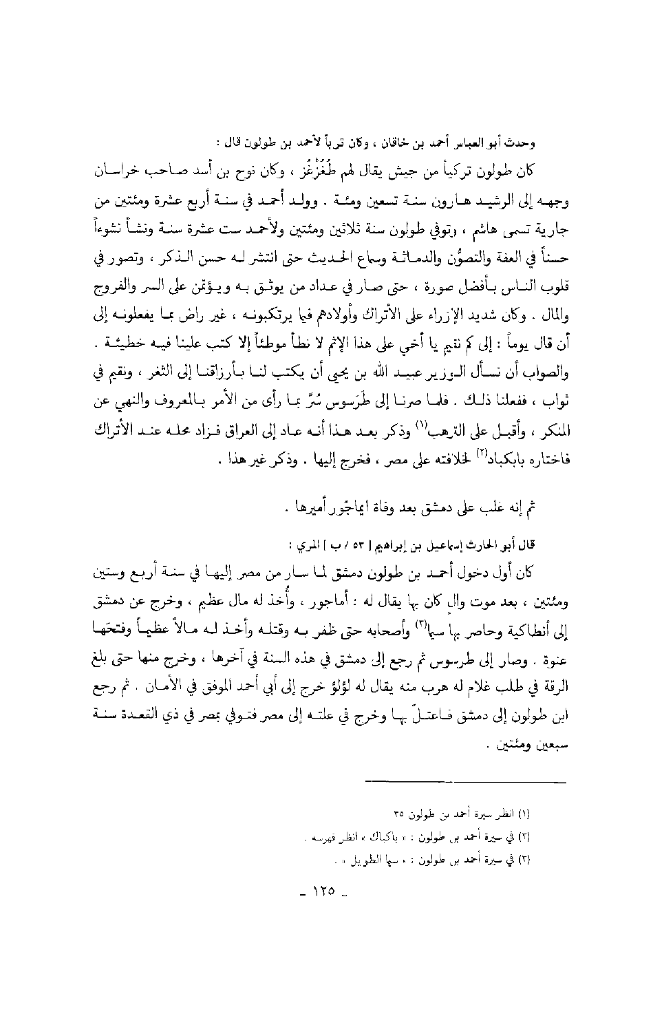 كان طولون تركياً من جيش يقال لهم طغرغز، وكان نوح بن أسد صاحب خراسان وجهه إلى الرشيد هارون سنة تسعين ومئة. وولد أحمد في سنة أربع عشرة ومئتين من جارية تسمى هاشم، وتوفي طولون سنة ثلاثين ومئتين ولأحمد ست عشر سنة ونشأ نشوءاً حسناً في العفة والتصون والدماثة وسماع الحديث حتى انتشر له حسن الذكر، وتصور في قلوب الناس بأفضل صورة، حتى صار في عداد من يوثق به ويؤتمن على السر والفروج والمال. وكان شديد الإزراء على الأتراك وأولادهم فيم يرتكبونه، غير راض بما يفعلونه إلى أن قال يوماً: إلى كم نقيم يا أخي على هذا الإيم لا نطأ موطئاً إلا كتب علينا فيه خطيئة. والصواب أن نسأل الوزير عبيد الله بن يحيى أن يكتب لنا بأرزاقنا إلى الثغر، ونقيم في ثواب، ففعلنا ذلك. فلما صرنا إلى طرسوس سر بما رأى من الأمر بالمعروف والنهي عن المنكر، وأقبل على الترهب وذكر بعد هذا أنه عاد إلى العراق فزاد محله عند الأتراك فاختاره بابكباد لخلافته على مصر، فخرج إليها. وذكر غير هذا.