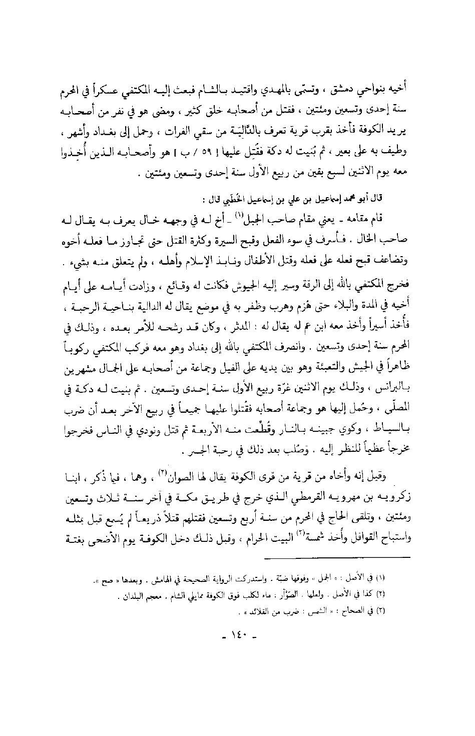 أخيه بنواحي دمشق، وتسمى بالمهدي واقتيد بالشام فبعث إليه المكتفي عسكراً في المحرم سنة إحدى وتسعين ومئتين، فقتل من أصحابه خلق كثير، ومضى هو في نفر من أصحابه يريد الكوفة فأخذ بقرب قرية تعرف بالدالية من سقي الفرات، وحمل إلى بغداد وأشهر، وطيف به على بعير، ثم بنيت له دكة فقتل عليها هو وأصحابه الذين أخذوا معه يوم الاثنين لسبع بقين من ربيع الأول سنة إحدى وتسعين ومئتين.