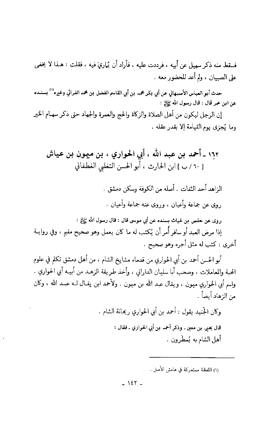 حدث أبو العباس الأصبهاني عن أبي بكر محمد بن أبي القاسم الفضل بن محمد الفراتي وغيره بسنده عن ابن عمر قال: قال رسول الله صَلَّى اللهُ عَلَيْهِ وَسَلَّمَ: إن الرجل ليكون من أهل الصلاة والزكاة والحج والعمرة والجهاد حتى ذكر سهام الخير وما يجزى يوم القيامة إلا بقدر عقله.