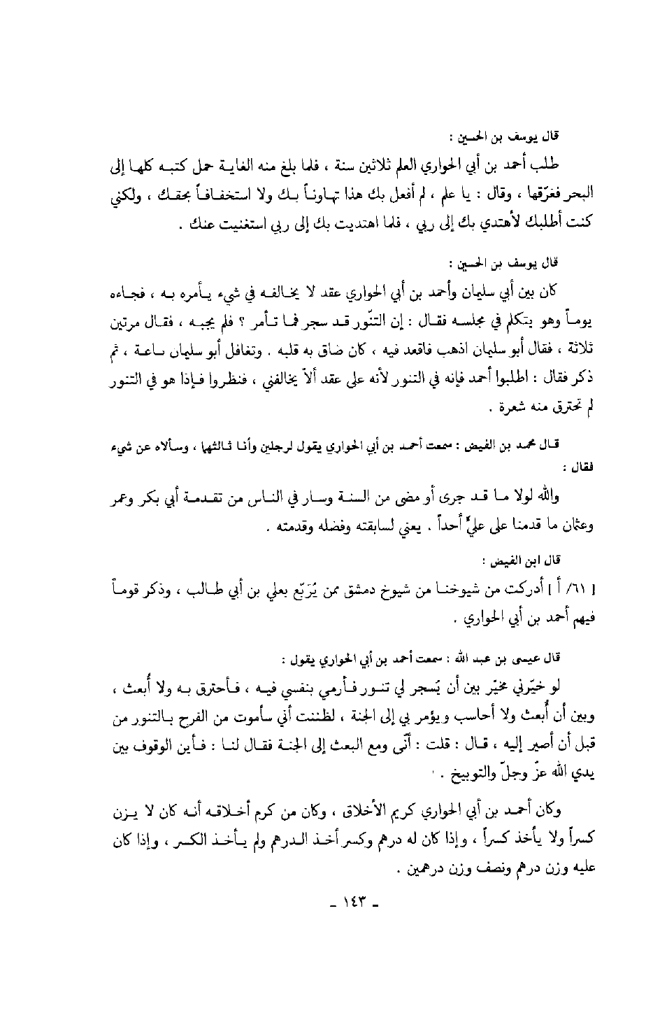 وكان أحمد بن أبي الحواري كريم الأخلاق، وكان من كرم أخلاقه أنه كان لا يزن كسراً ولا يأخذ كسراً، وإذا كان له درهم وكسر أخذ الدرهم ولم يأخذ الكسر، وإذا كان عليه وزن درهم ونصف وزن درهمين.