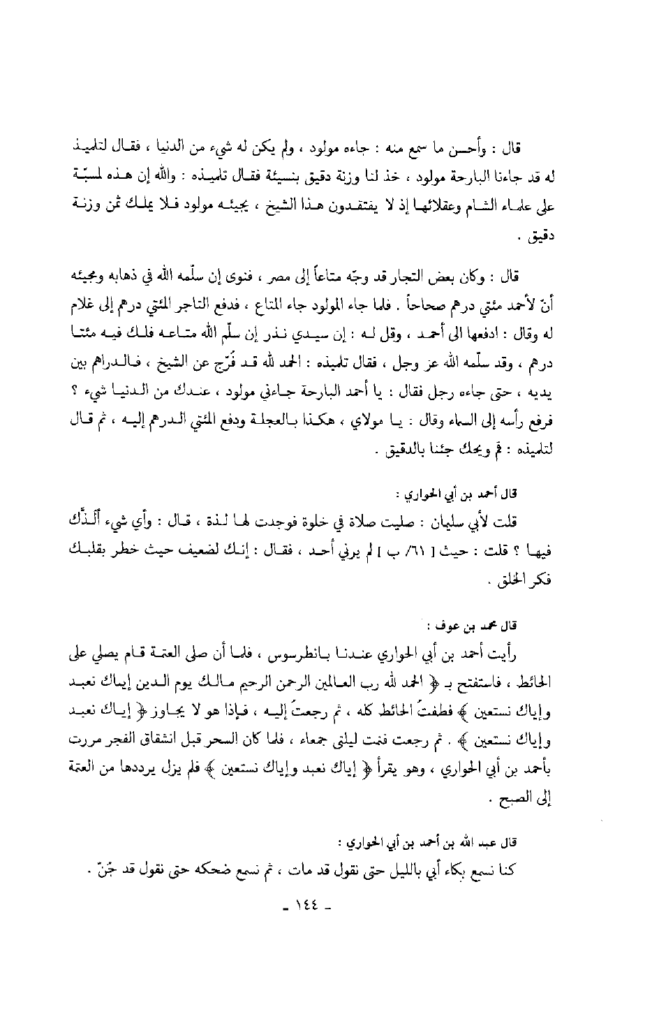 قال محمد بن عوف: رأيت أحمد بن أبي الحواري عندنا بانطرسوس، فلما أن صلى العتمة قام يصلي على الحائط، فاستفتح ب " الحمد لله رب العالمين الرحمن الرحيم مالك يوم الدين إياك نعبد وإياك نستعين ". ثم رجعت فنمت ليلتي جمعاء، فلما كان السحر قبل انشقاق الفجر مررت بأحم بن أبي الحواري، وهو يقرأ " إياك نعبد وإياك نستعين " فلم يزل يرددها من العتمة إلى الصبح.
