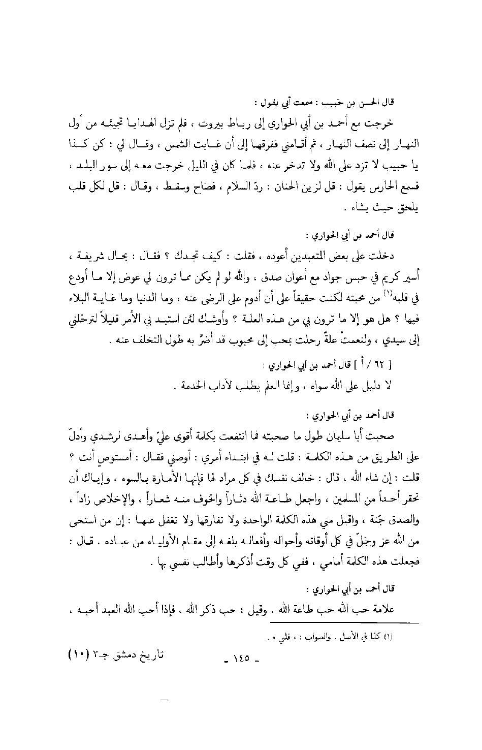 خرجت مع أحمد بن أبي الحواري إلى رباط بيروت، فلم تزل الهدايا تجيئه من أول النهار إلى نصف النهار، ثم أقامني ففرقها إلى أن غابت الشمس، وقال لي: كن كذا يا حبيب لا تزد على الله ولا تدخر عنه، فلما كان في الليل خرجت معه إلى سور البلد، فسمع الحارس يقول: قل لزين الحنان: رد السلام، فصاح وسقط، وقال: قل لكل قلب يلحق حيث يشاء.