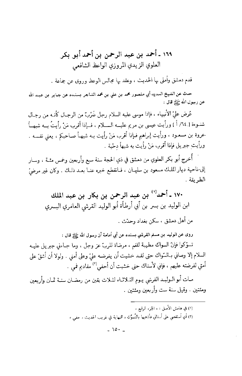 روى عن الوليد بن مسلم القرشي بسنده عن أبي أمامة أن رسول الله صَلَّى اللهُ عَلَيْهِ وَسَلَّمَ قال: تسوكوا فإن السواك مطيبة للفم، مرضاة للرب عز وجل، وما جاءني جبريل عليه السلام إلا وصاني بالسواك حتى لقد خشيت أن يفرضه علي وعلى أمتي. ولولا أن أشق على أمتي لفرضته عليهم، فإني لأستاك حتى خشيت أن أحفي مقاديم فمي.