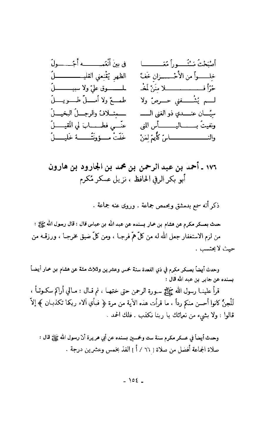 وحدث أيضاً في عسكر مكرم سنة ستة وخمسين بسنده عن أبي هريرة أن رسول الله صَلَّى اللهُ عَلَيْهِ وَسَلَّمَ قال: صلاة الجماعة أفضل من صلاة الفذ بخمس وعشرين درجة.