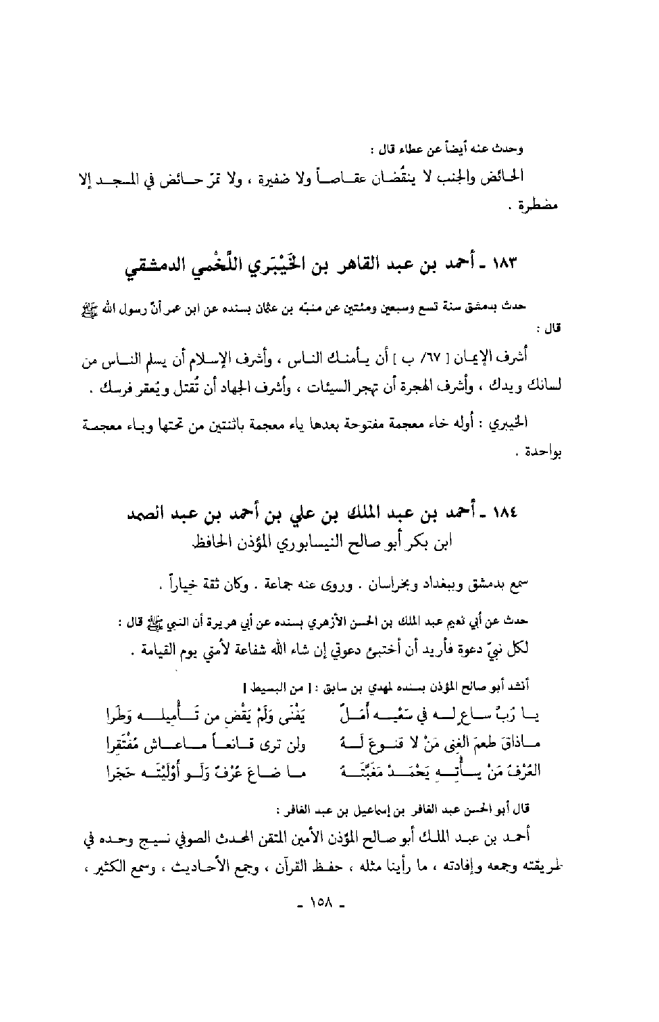 اللخمي الدمشقي حدث بدمشق سنة تسع وسبعين ومئتين عن منبه بن عثمان بسنده عن ابن عمر أن رسول الله صَلَّى اللهُ عَلَيْهِ وَسَلَّمَ قال: أشرف الإيمان أن يأمنك الناس، وأشرف الإسلام أن يسلم الناس من لسانك ويدك، وأشرف الهجرة أن تهجر السيئات، وأشرف الجهاد أن تقتل ويعقر فرسك.