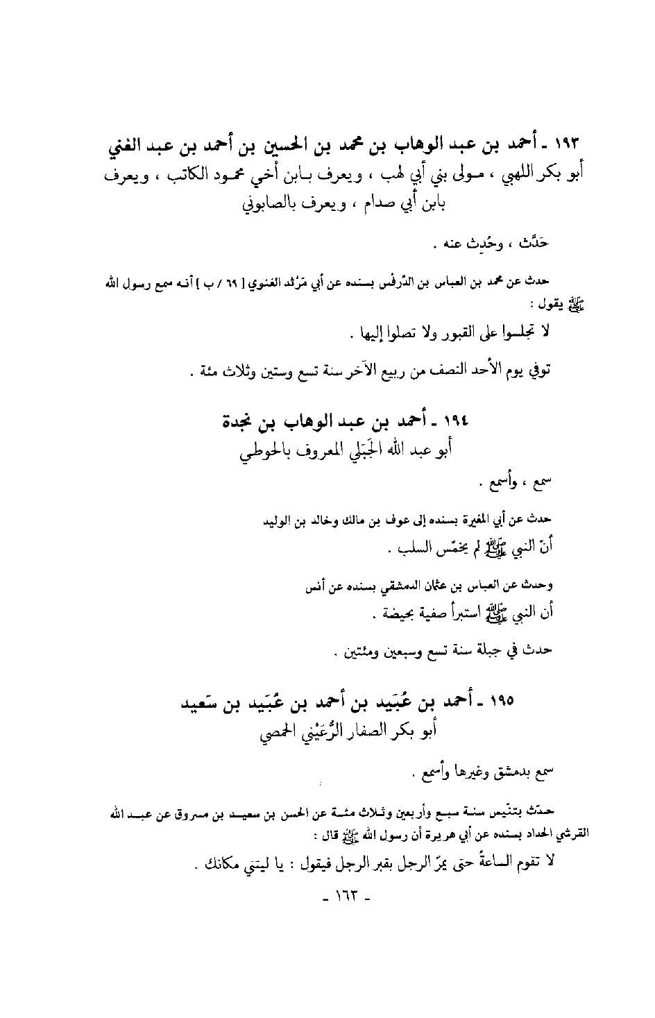 حدث عن محمد بن العباس بن الدرفس بسنده عن أبي مرثد الغنوي أنه سمع رسول الله صَلَّى اللهُ عَلَيْهِ وَسَلَّمَ يقول: لا تجلسوا على القبور ولا تصلوا إليها.