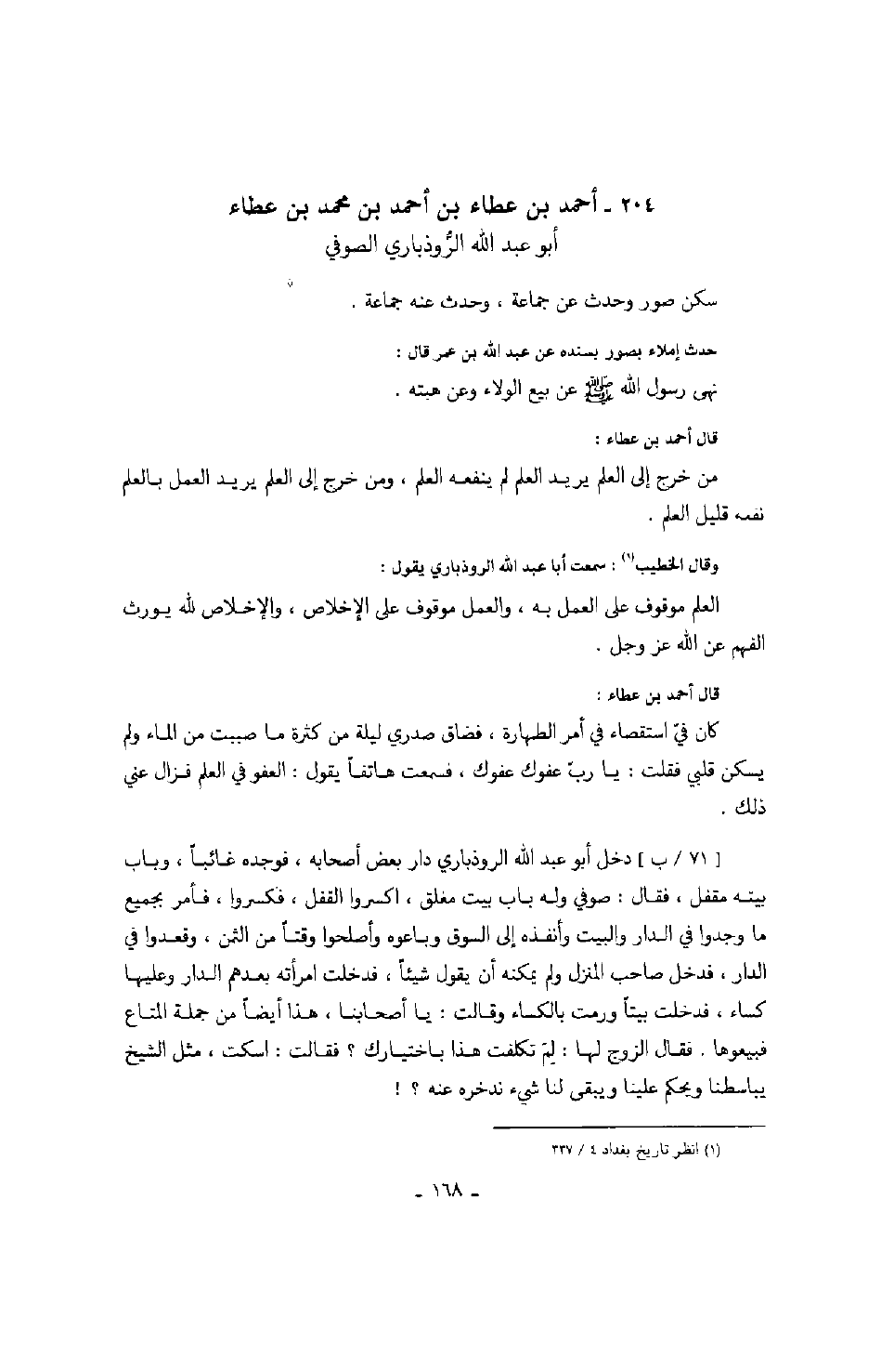 قال أحمد بن عطاء: كان في استقصاء في أمر الطهارة، فضاق صدري ليلة من كثرة ما صببت من الماء ولم يسكن قلبي فقلت: يا رب عفوك، فسمعت هاتفاً يقول: العفو في العلم فزال عني ذلك.