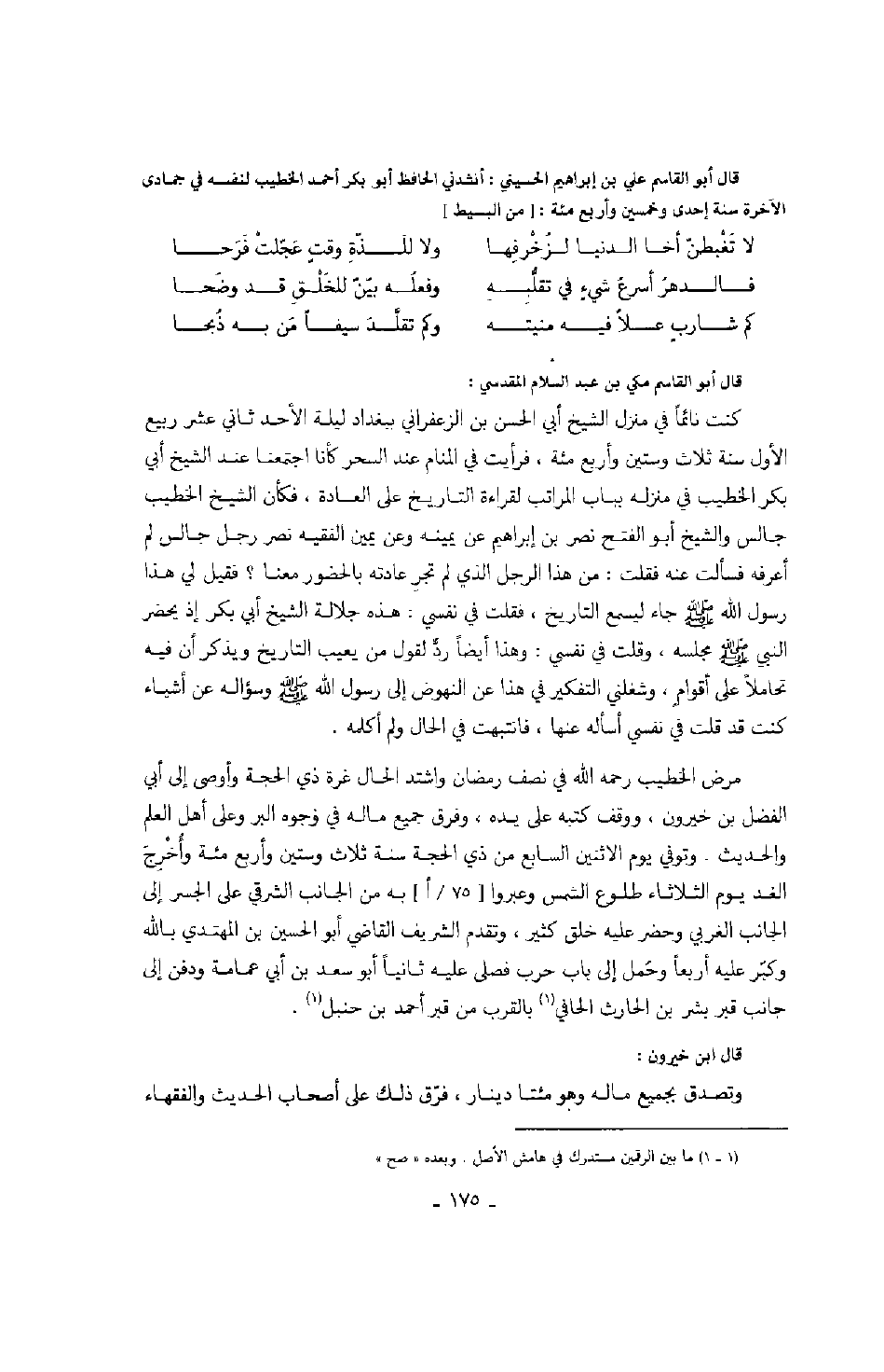 قال أبو القاسم علي بن إبراهيم الحسيني: أنشدني الحافظ أبو بكر أحمد الخطيب لنفسه في جمادى الآخرة سنة إحدى وخمسين وأربع مئة: من البسيط